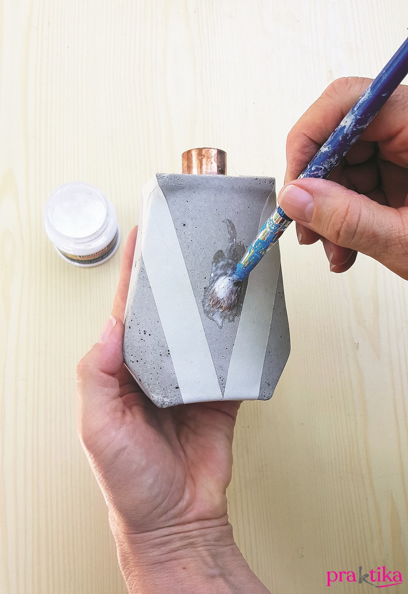 4. A mintázáshoz az egyik gyertyatartó elején az alja vonalának közepétől a sarkok irányába húzz ceruzavonalakat, és tapassz fel kívülről egy-egy csík maszkolószalagot. A belső háromszöget kend le füstfóliaragasztóval. Hagyd megszikkadni.
