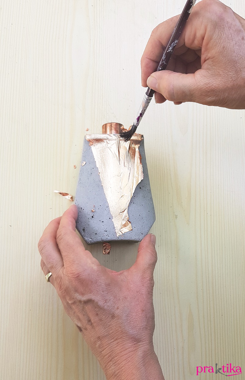 1. Mosd ki az üvegeket, és ecsettel olajozd ki belül, hogy ne tapadjon majd hozzájuk a beton. Egy tálban a hobbibetont keverd össze vízzel, a használati utasítás szerint. Hagyd állni a betonmasszát néhány percig, majd kanalazd az előkészített üvegekbe – a nyakak aljáig töltsd fel. Finoman ütögesd az üvegek alját az asztallaphoz, hogy távozhassanak a légbuborékok. Fogd a karmantyúkat, és függőlegesen nyomd az üvegek nyakánál a masszák közepébe, körülbelül a csövek feléig. Ha gondolod, kisebb kavicsokkal le is súlyozhatod a fémet.