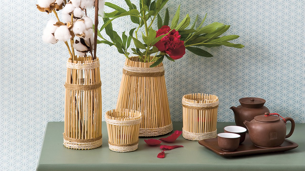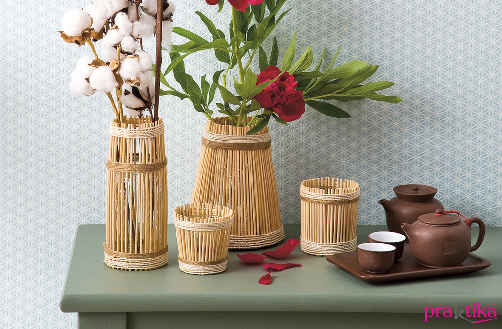 Hozzávalók • bambusz saslikpálcák • parafa alátét, Ø kb. 13 cm • pamut- és kenderzsineg • üres befőttes üvegek, poharak • melegragasztó • csípőfogó