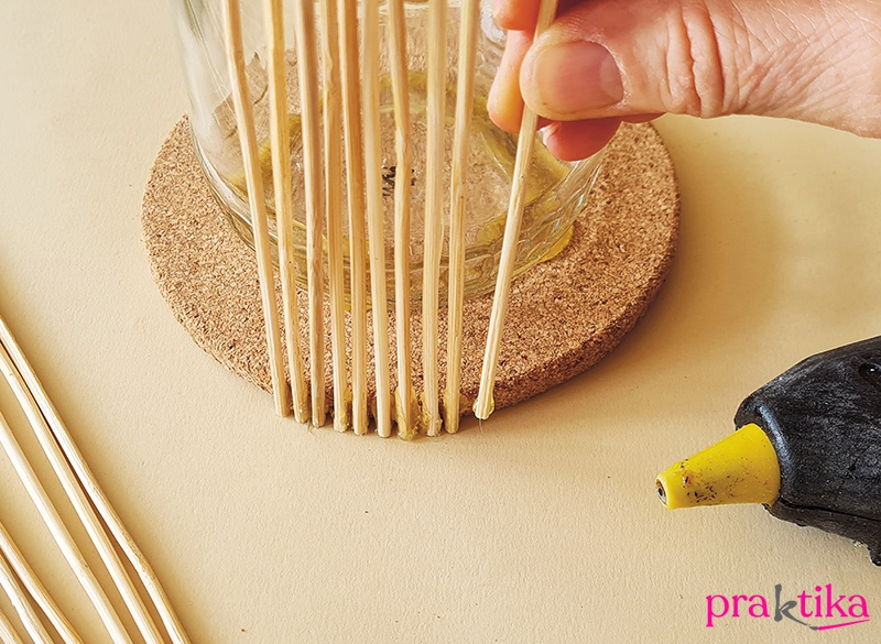 Egy bambuszpálca aljára tegyél egy csepp melegragasztót, és nyomd a parafa szélére. Ha kihűlt a ragasztó, szilárdan áll a pálca, jöhet a következő, amit az előzőtől 2-3 mm távolságban ragassz fel. Így haladj körben.