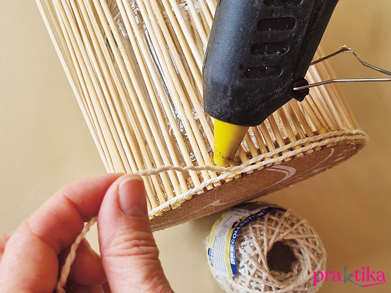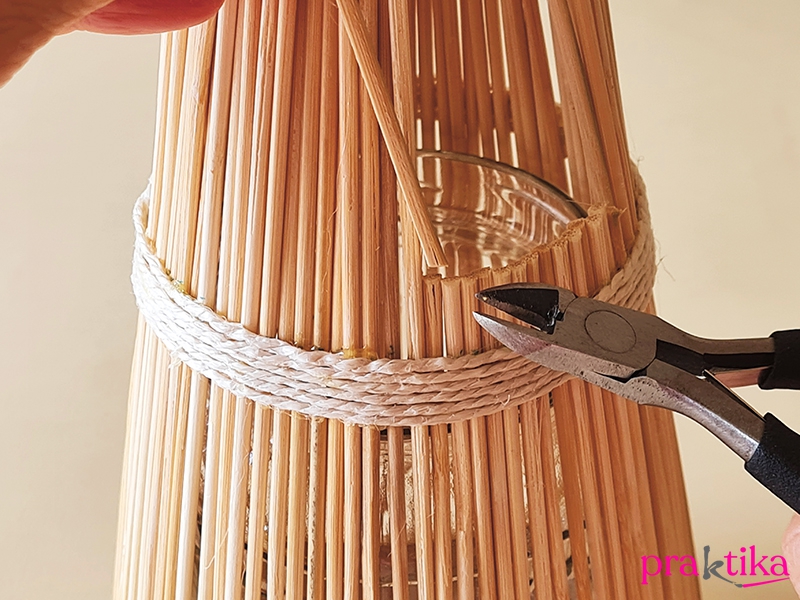 A váza/mécsestartó tervezett pereme alatt is ragassz a pálcákra zsinegsorokat, de a parafára ragasztott váza pálcáit előbb fogd össze fönt egy gumigyűrűvel, úgy lesz keskeny a váza szája. Az izgalmasabb színhatásért váltogathatod a pamut- és a kenderzsinegeket.