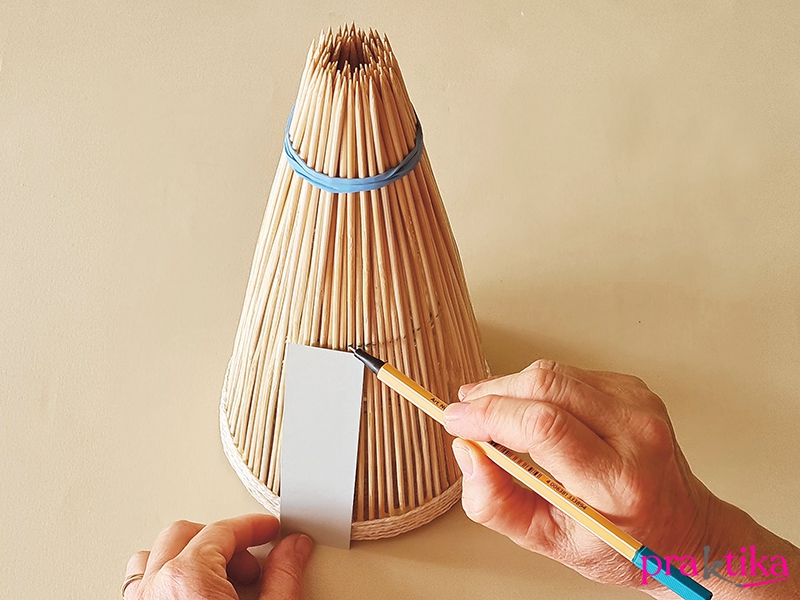 Vágj egy olyan hosszú papírcsíkot, amilyen magas vázát/mécsestartót szeretnél, és ezt mércének használva jelöld meg körben a magasságot. A csípőfogóval egyenként csípd le a pálcákat.