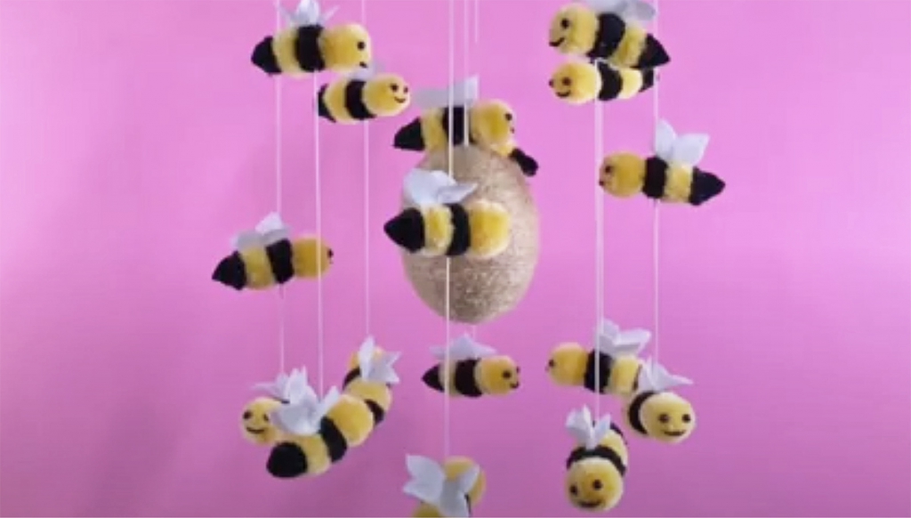 Egy villa segítségével készíts pomponokat: egy méhecskéhez két-két kisebb sárga és fekete darabra lesz szükséged. Ragaszd össze őket, majd ne feledkezz meg a szárnyukról, a szájukról és a szemükről sem. előbbieket filcből, utóbbiakat gyöngyökből is elkészítheted. Egy hungarocell tojást tekerj be zsinórral, ez lesz a méhkas, majd az elkészült darabokat rögzítsd hímzőkeretre és akaszd fel.