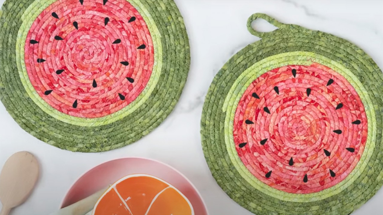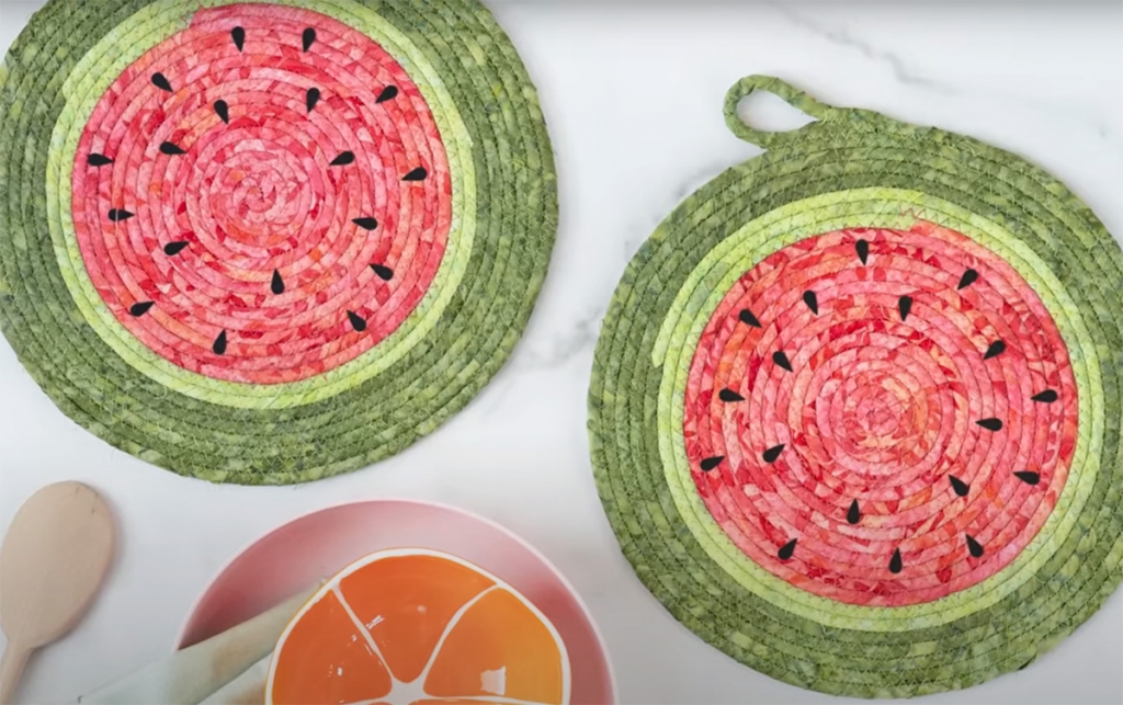 Rózsaszín, valamint világos- és sötétzöld textilből szabj ki két-három centiméter vastag csíkokat, majd kezdd el őket rátekerni egy vastagabb kötélre. Gombostűvel rögzítsd a csigaformát, majd varrógéppel öltsd egymáshoz a színes zsinórt. Folyamatosan tekerd, majd amikor nagyból megfelelő méretűnek érzed, válts a rózsaszínről a zöldre. Két-három kör után varrd el a végét, de akár egy hurkot is képezhetsz, hogy fel tudd akasztani, amikor nem használod. Végül díszítésként fekete filcből kivágott magokat is rögzíthetsz az alátéthez.