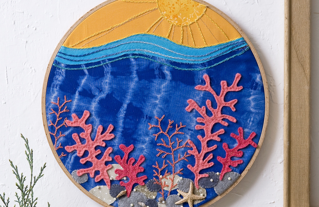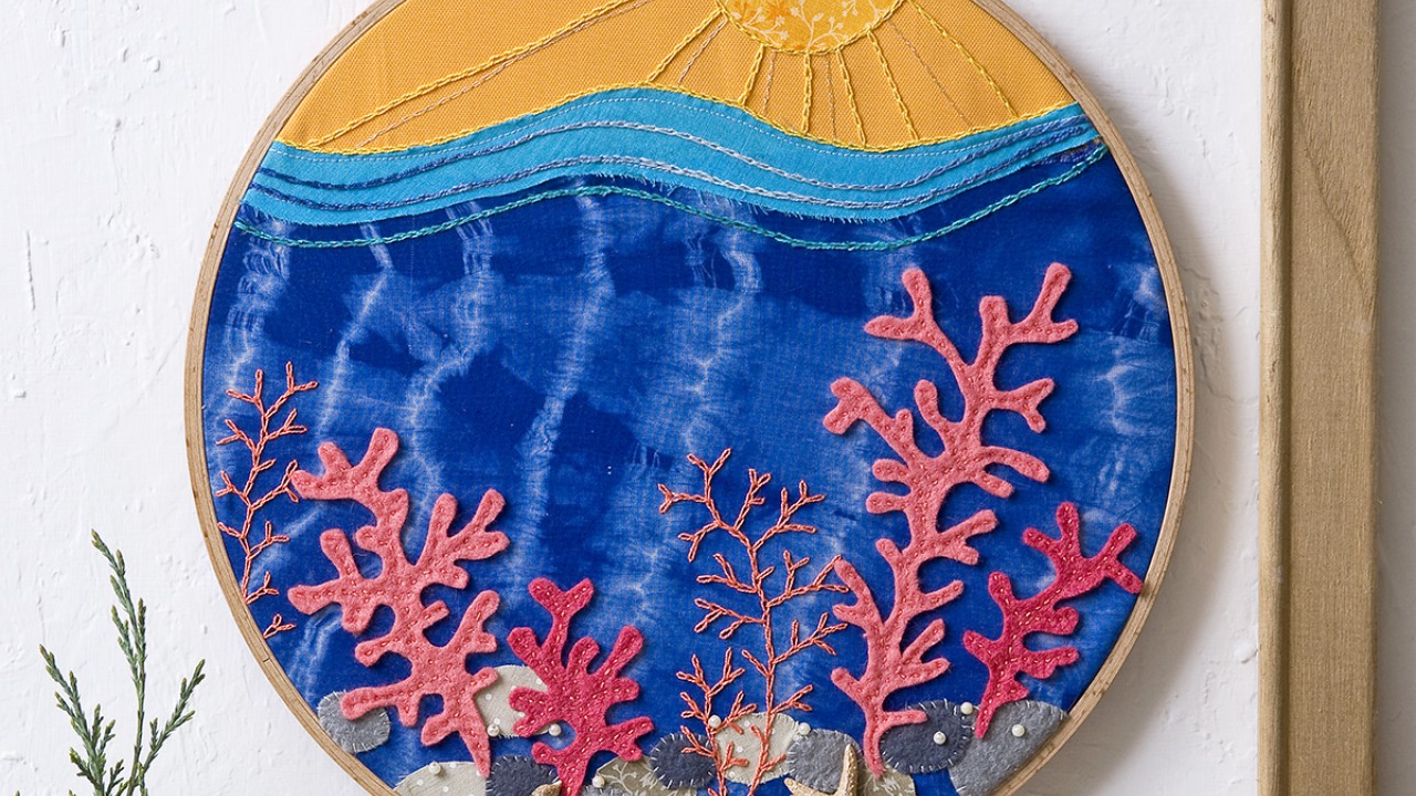 A szürke árnyalatú filcekből vágj korongokat, és apró öltésekkel varrd fel őket az alsó részre kavicsoknak. Apró csigákkal vagy gyöngyökkel gazdagíthatod a képet. Vágj ki korallokat a megfelelő színű filcből, és fércöltéssel varrd fel az alapra őket. Láncöltéssel hímezz további korallokat.