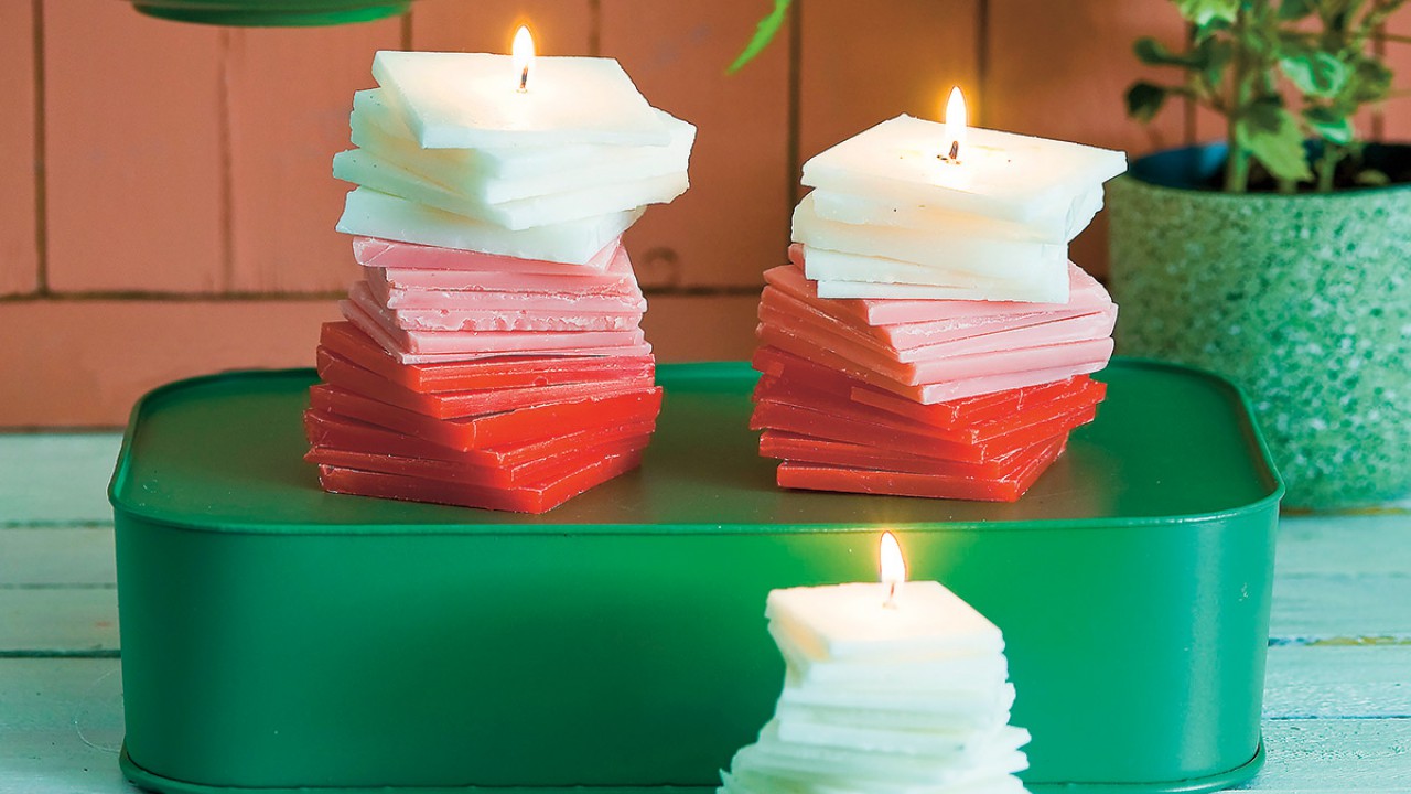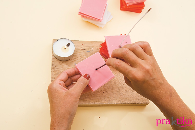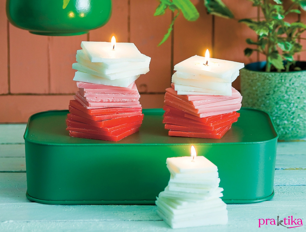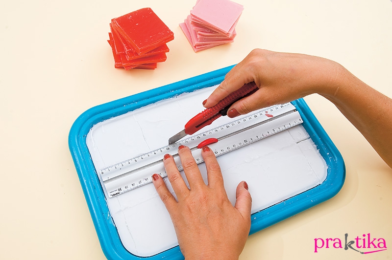 Oszd fel nagyjából egyenlő méretű négyzetekre, és a vonalzó mentén sniccerrel vágd is fel a viaszlapot. Óvatosan vedd ki a négyzeteket a tálcából. Ugyanígy önts egy adag színes viaszt, és vágd fel ezt is. A maradék fehér és színes viaszt olvaszd össze, hogy kapj egy köztes, halványabb árnyalatot, és ebből is készíts lapokat.