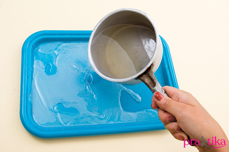 A fehér viaszt tedd üvegbe, majd helyezd egy fazékba. Tölts a fazékba vizet úgy, hogy az üveg pár ujjnyira álljon benne. Alacsony hőmérsékleten, a vízfürdőben olvaszd fel a viaszt és öntsd a tálcára kb. fél cm