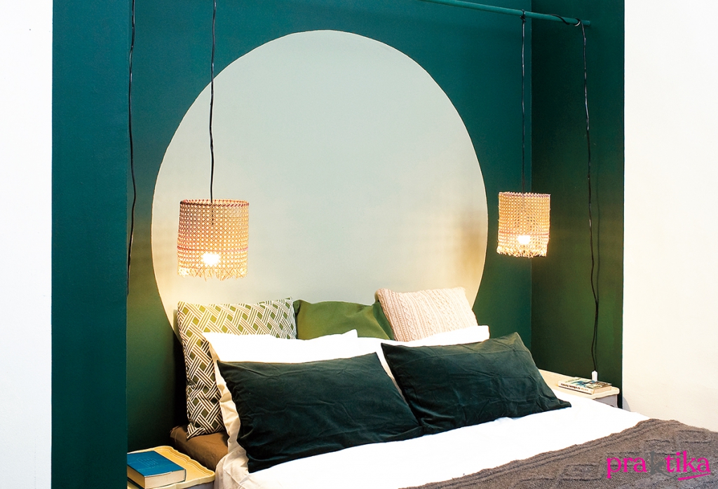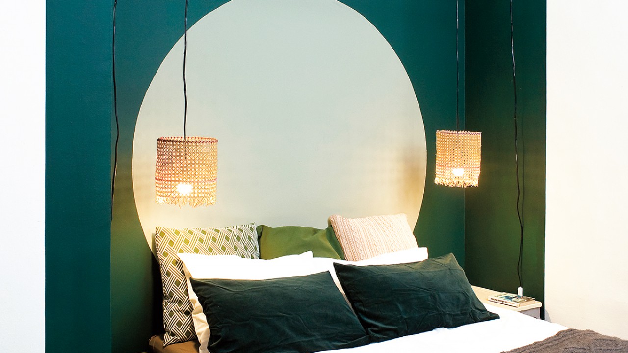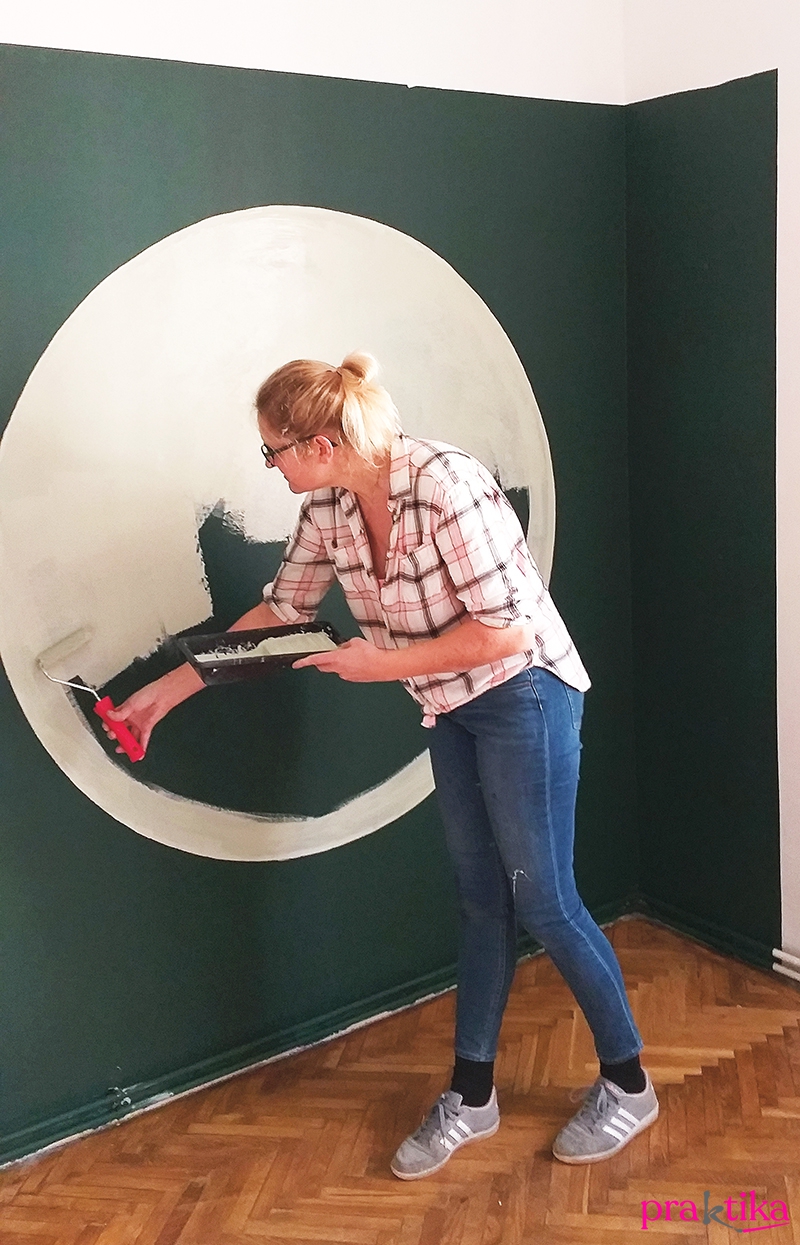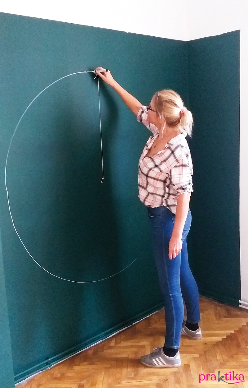 A festett falszakasz közepére verj be egy szöget, köss rá egy darab madzagot, aminek a másik végre köss egy ceruzát. Mintha egy óriási körzőt használnál, rajzolj fel egy nagy kört a falra. A vékonyabb ecsetet használva a világoszöld falfestékkel fesd meg óvatosan a kör szélét, majd a vastagabb ecsettel és hengerrel fesd ki az egészet. Fesd le még egy rétegben, ha foltos maradna.