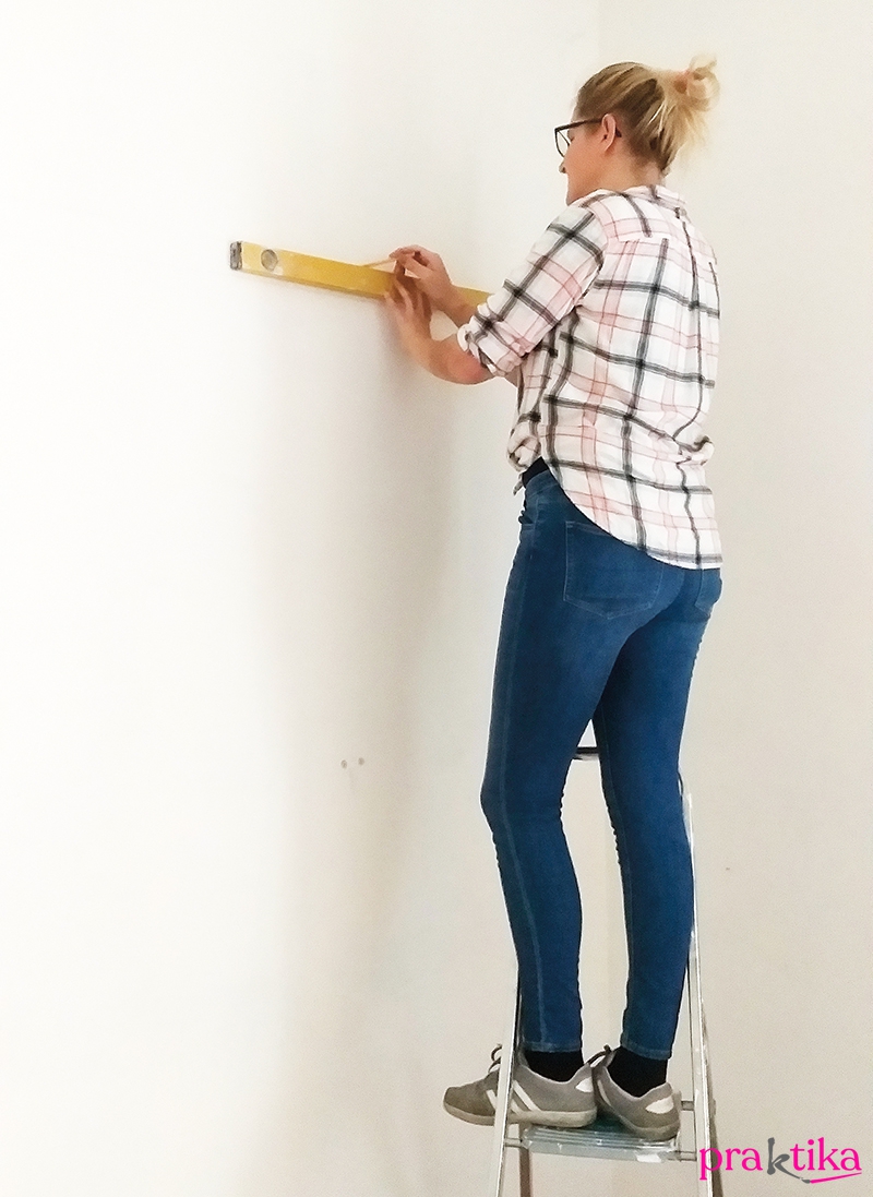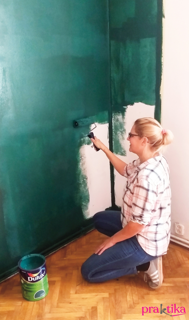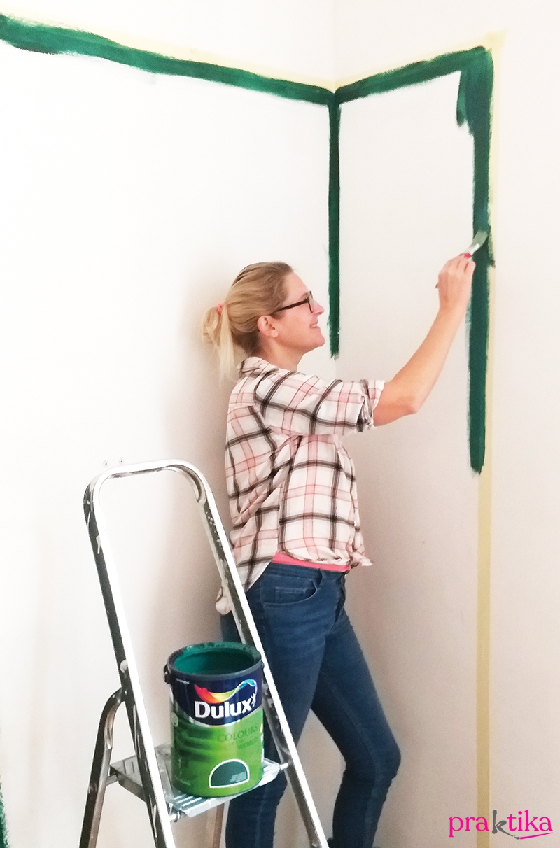 Festőszalaggal határold le a festendő területet, a padlónál se hagyd ki. A szélesebb ecsettel fesd meg a széleket és sarkokat.