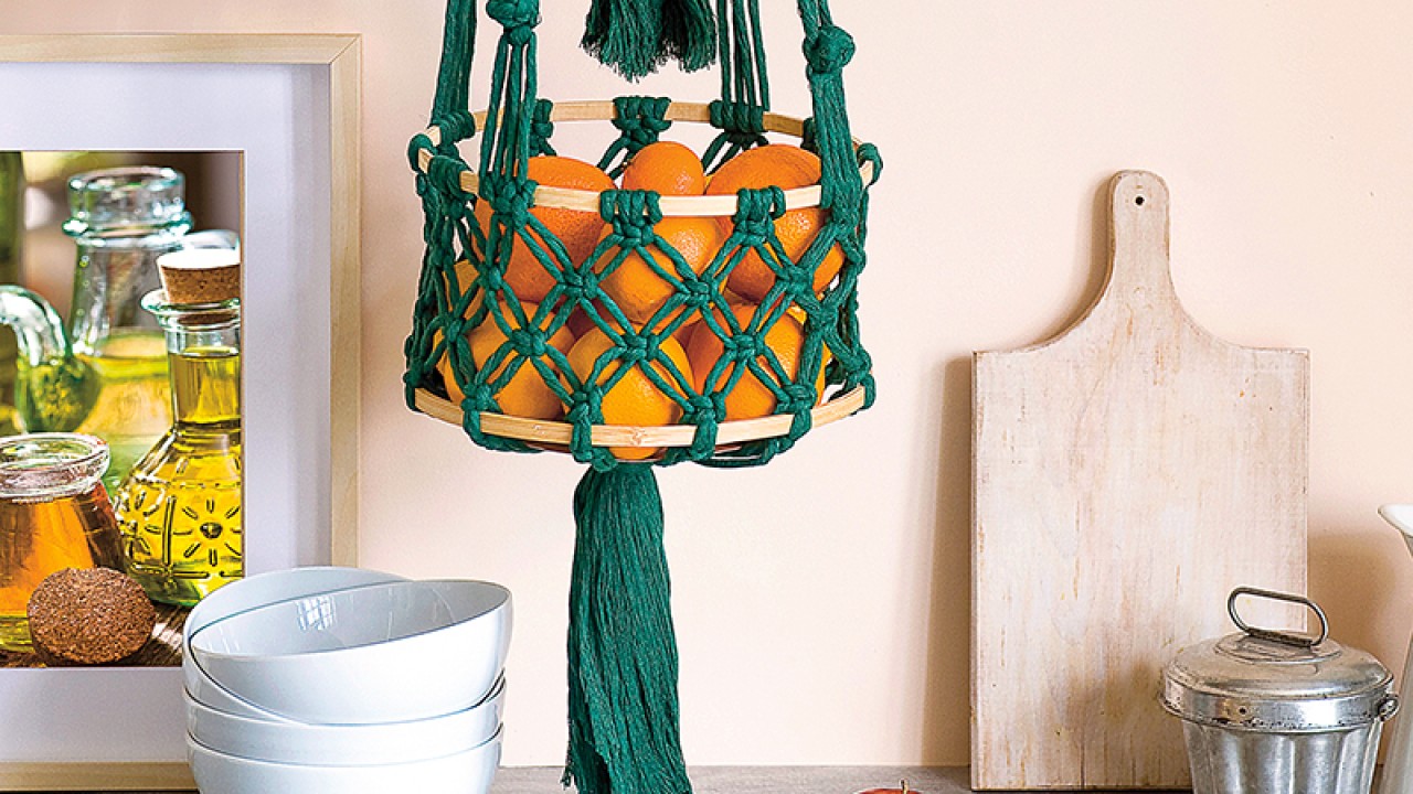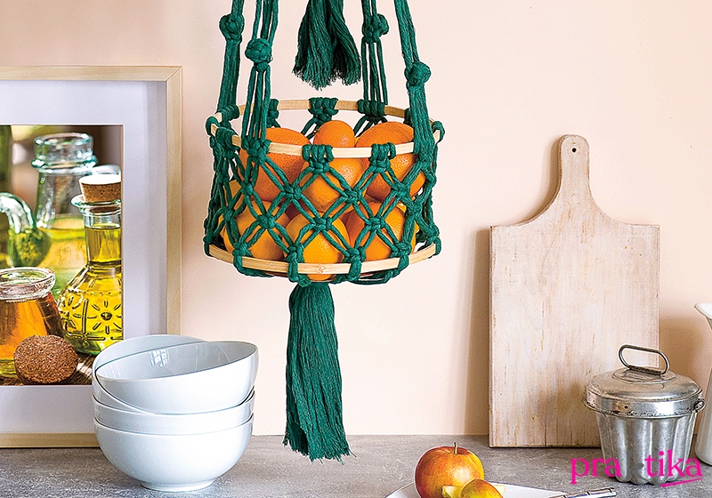 A tartószálakra 10 cm-rel lejjebb köss egy-egy bogyót, majd 10 cm-rel lejjebb tekerd a szálakat az egyik nagyobb rámára és köss laposcsomót alá, ahogy a fenti kosárnál. A tartószálak közé ennél négy-négy félbehajtott 2,5 m-es szálat rögzíts kezdőcsomóval. Készíts hálót, ahogy a felső kosárnál, de most háromszor válaszd szét a szálakat. Fogd a szálak közé a ráma másik felét és fejezd be a kosarat, ahogy a felsőt. Ezúttal az összes szálat fogd össze alul, köss rá öszszekötőcsomót és végül vágd a bojtot 20 cm-esre. Fésüld is ki.