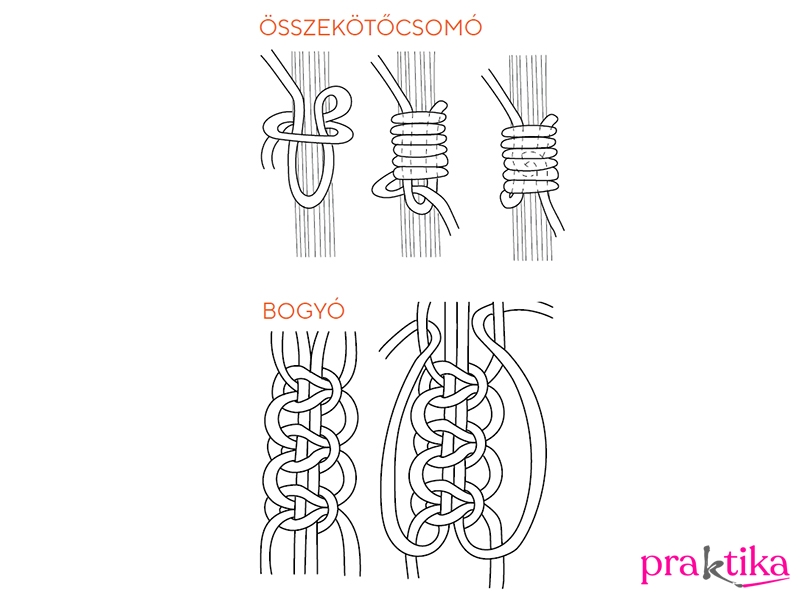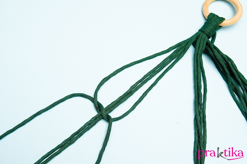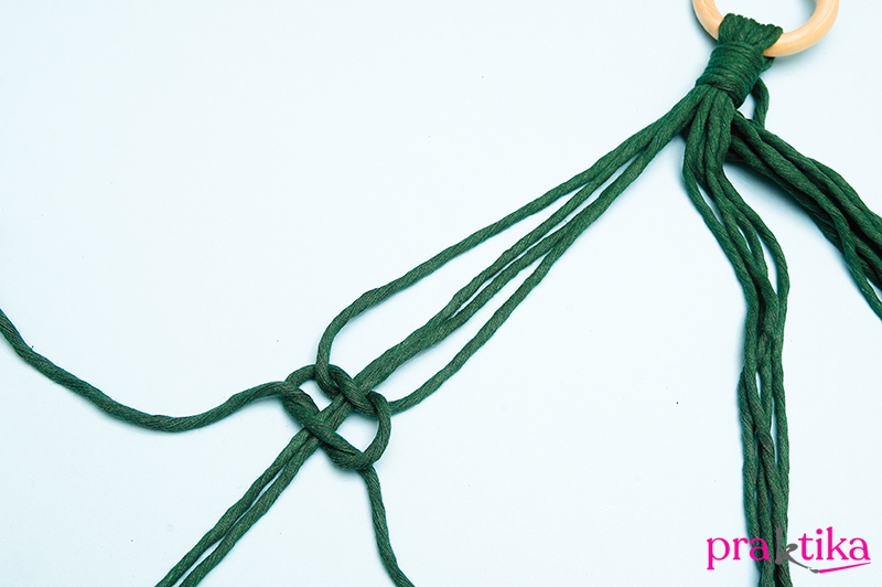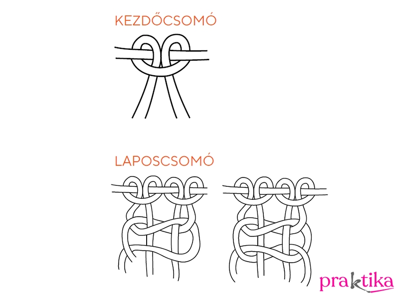 Válaszd szét a köteget két négyes csoportra. Fogd az egyiket, és 10 cm-rel az összefogó csomó alá köss 3 laposcsomót egymás után: középső két szál a vezető szál, erre először a jobb oldalsó szálat fektesd keresztbe, majd a bal oldali szálvéget fűzd át alulról a vezetőszálak alatt és húzd előre a vezetőszálak és a jobb oldali szál között. Ismételd meg a bal oldali szállal elöl és a jobb oldalit vezesd hátul és húzd előre. Húzd meg a csomót. Készíts hármat.