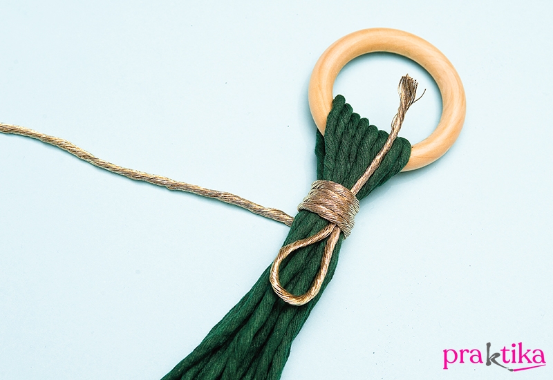 Vágj a fonalból 8 db 4 méter hosszú szálat a fő tartószálaknak, 8 db 2 méter hosszú szálat a felső kosárhoz és 16 db 2,5 méter hosszú szálat az alsóhoz. Fűzd át a 4 méteres szálakat a karikán úgy, mindkét oldalon egyenlő hosszan lógjon le.