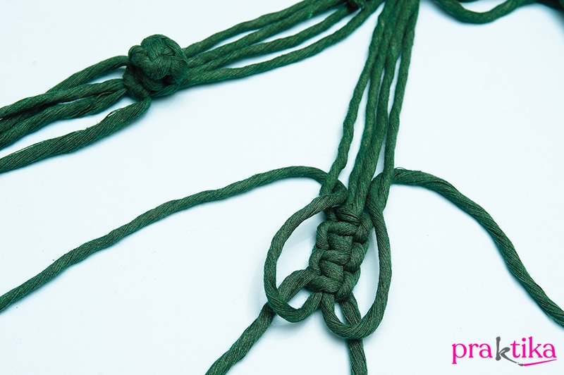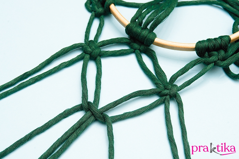 Fogj össze a vezetőszálakból két szélső szálat és a mellette lévő most felcsomózott szálakból kettőt és ebből a négy szálból köss laposcsomót és folytasd így körben. Ismét fogj össze négy szálat úgy, hogy kettő-kettő szomszédosat fogsz össze. Köss rájuk laposcsomót. Így kialakul az hálóhoz hasonló mintázat, ahogy a szálak keresztezik egymást.