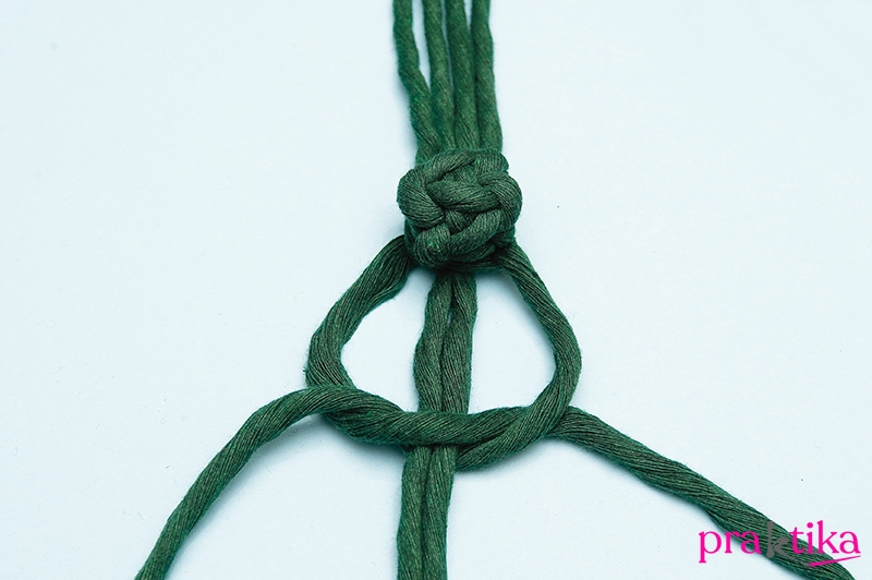 A két vezetőszálat hajtsd fel, és fűzd át felül a vezetőszálak mellett. Húzd le őket hátul, így a laposcsomók felkunkorodnak egy bogyóvá. A vezetőszálak köré alul köss ismét egy laposcsomót, hogy rögzítse a bogyót. Köss a többi 3 tartószálra is egy-egy bogyót.