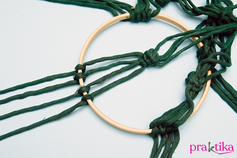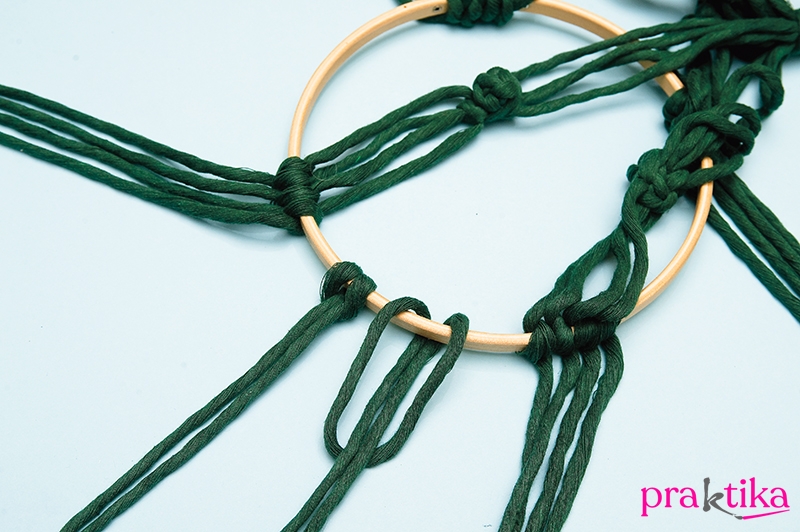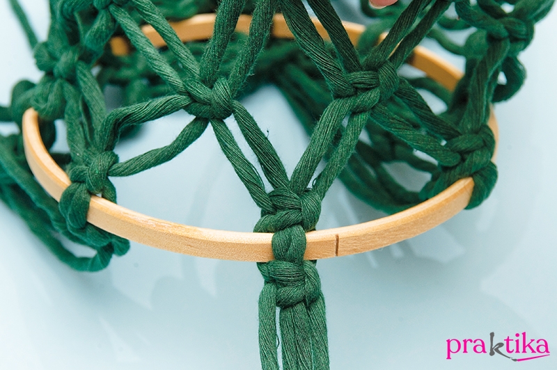 A bogyók alatt 13 cm-rel tekerd át a szálakat egyesével a kisebb hímzőráma egyik karikáján, majd mindegyikre köss alul egy-egy laposcsomót, amivel rögzíted. A tartószálak közé csomózz fel két-két félbehajtott 2 m-es szálat. Mindegyik alá köss egy-egy laposcsomót.