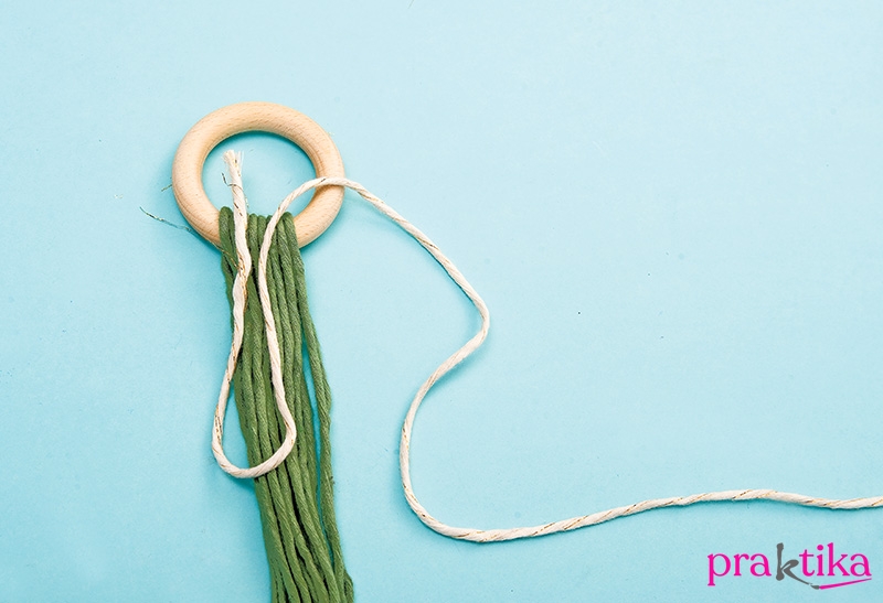 A makraméfonalból vágj 8 db kb. 3 méter hosszú darabot, bújtasd át őket a fakarikán, és a szálakat félbehajtva fogd össze a köteget. Vágj egy kb. 50 cm-es darabot (mi a fotón a jobb láthatóság kedvéért eltérő színű fonalat használunk), és hajts egy hurkot a köteg elé a képen látható módon.