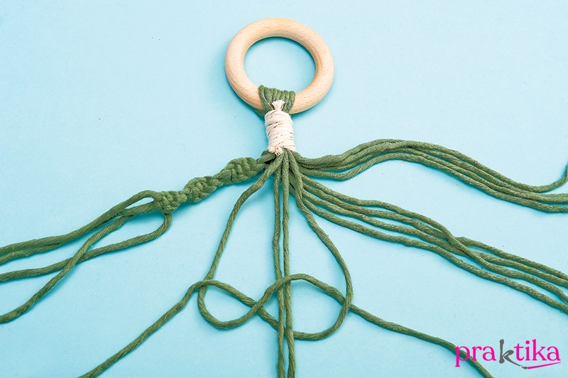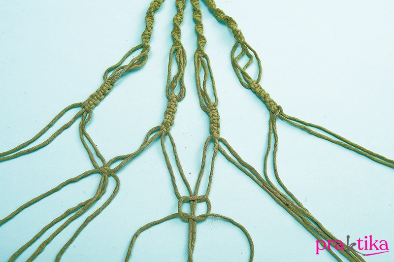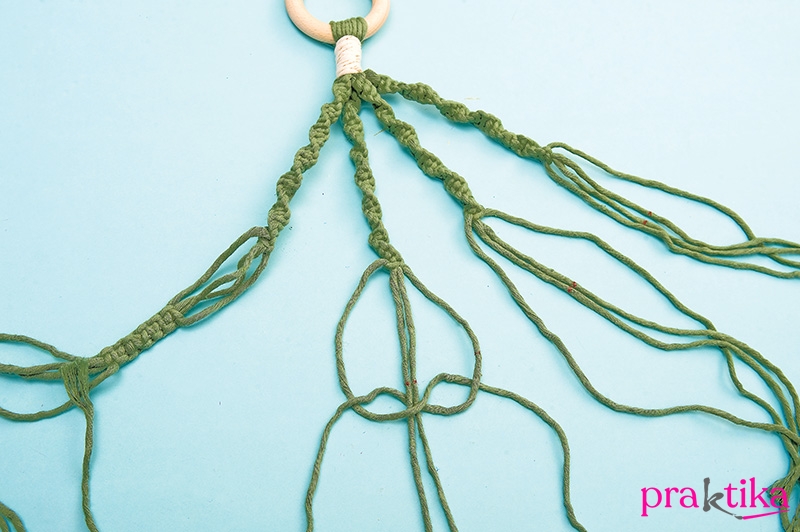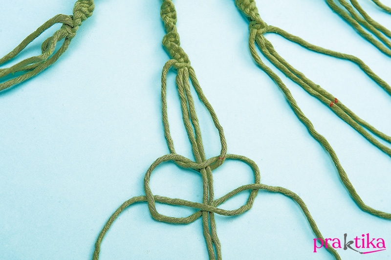 Hagyj ki egy 8 cm-es szakaszt, majd jön a tartó „hasának” kialakítása. A négyes blokkok két-két szomszédos szálait összefogva készíts két csomót (dönthetsz, hogy két ugyanolyan, vagy két ellentétes csomót kötsz, így vagy egy kis lapos-, vagy egy kis spirálcsomó alakul ki – mi lapos csomót készítettünk). Ugyanígy csomózd össze a következő 4 szálat, az azt következőt, végül az utolsó egység két szálát az első egység szabadon maradt két szálával.