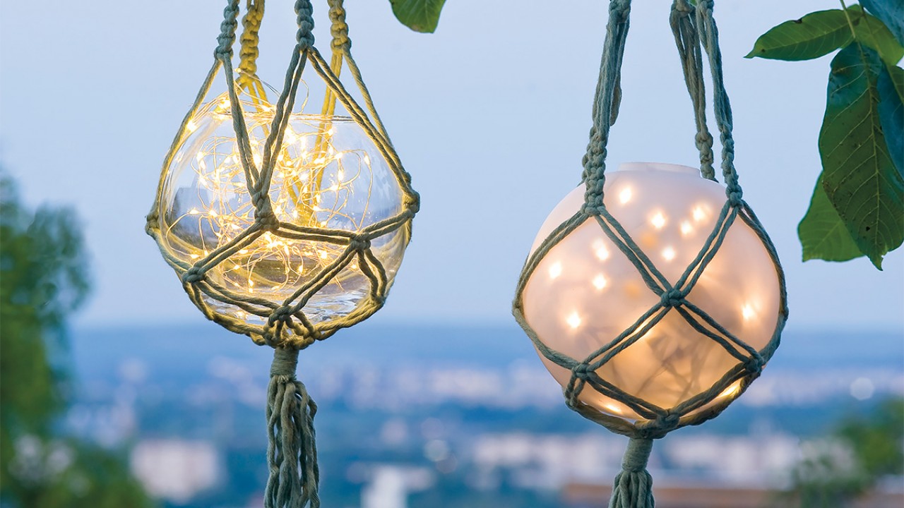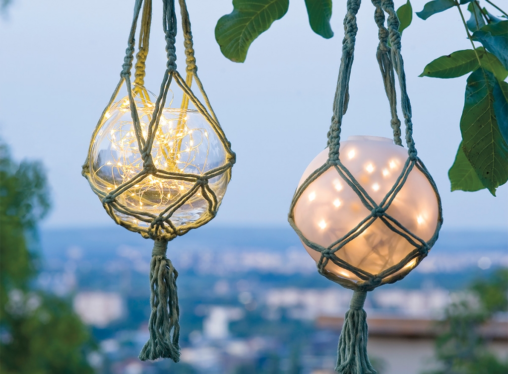 Hozzávalók • 25-30 m vastag makraméfonal • 1 db fakarika, Ø 8 cm • régi üveg lámpabúra vagy gömbölyű üvegtál • napelemes izzósor