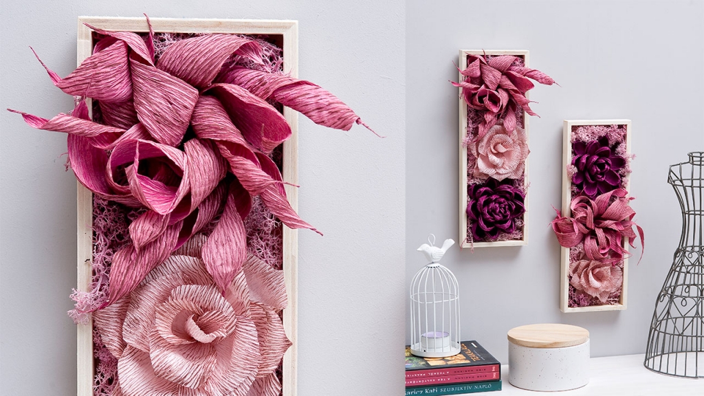 Függőleges fali dekor kreppvirágokkal: üde színfolt lehet a téli szürkeségben!
