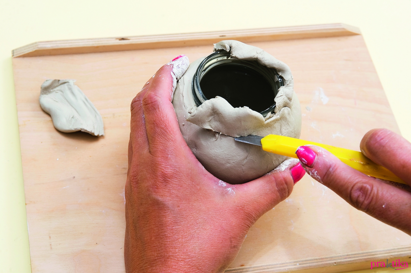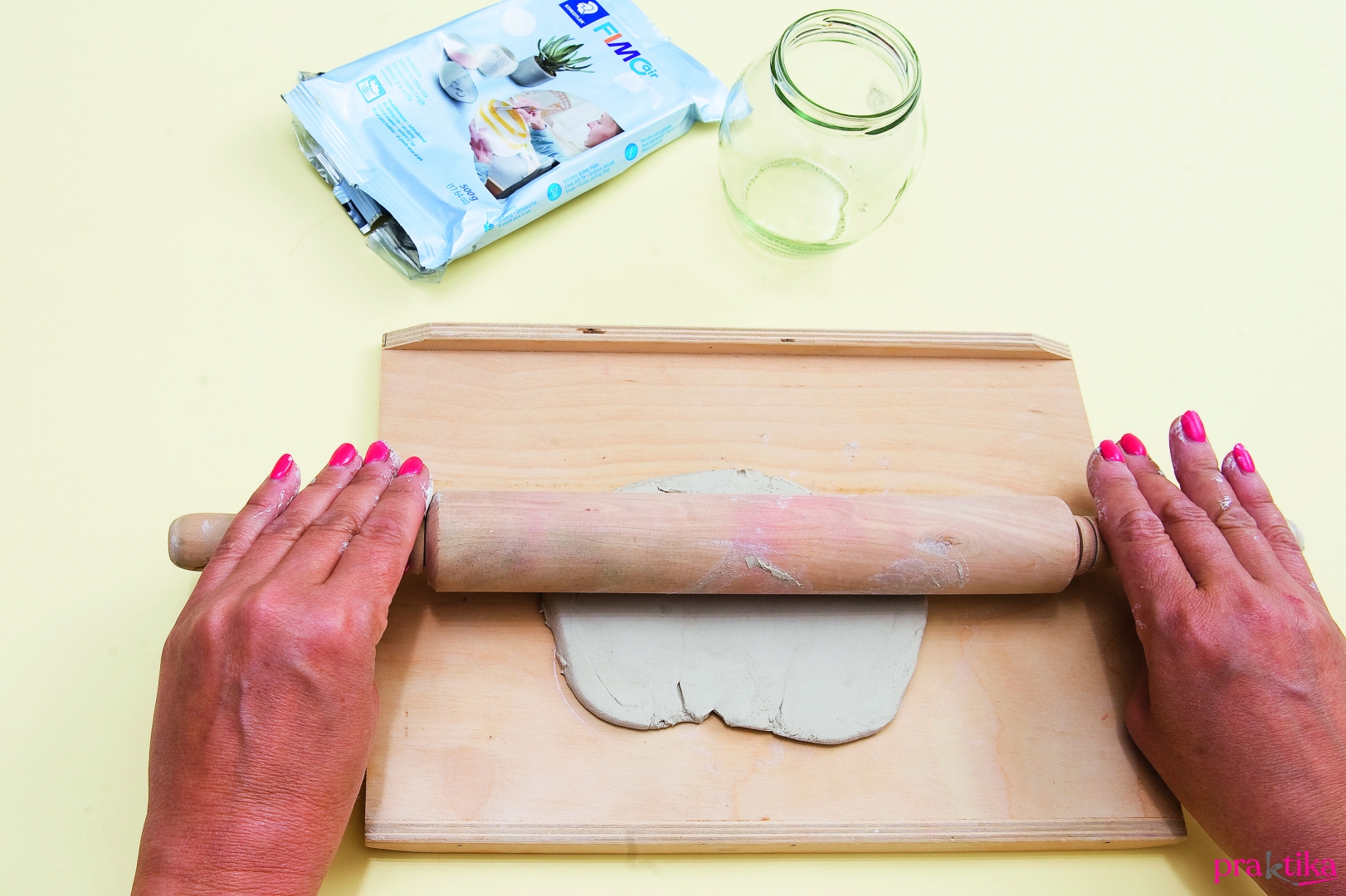 - Szakíts le egy nagyobb darabot a gyurmából, és sodrófával nyújtsd ki 0,7-1 cm vastagra. Borítsd be vele a befőttesüveget. Az egymásra érő széleket az ujjaiddal dolgozd össze. Ha egy szakasz kimaradt, nyugodtan nyomj oda egy megfelelő méretű gyurmadarabot, és dolgozd össze a többivel. Ezután finoman hengergesd meg a befőttesüveget a nyújtódeszkán, hogy nagyjából sima felületet kapj.