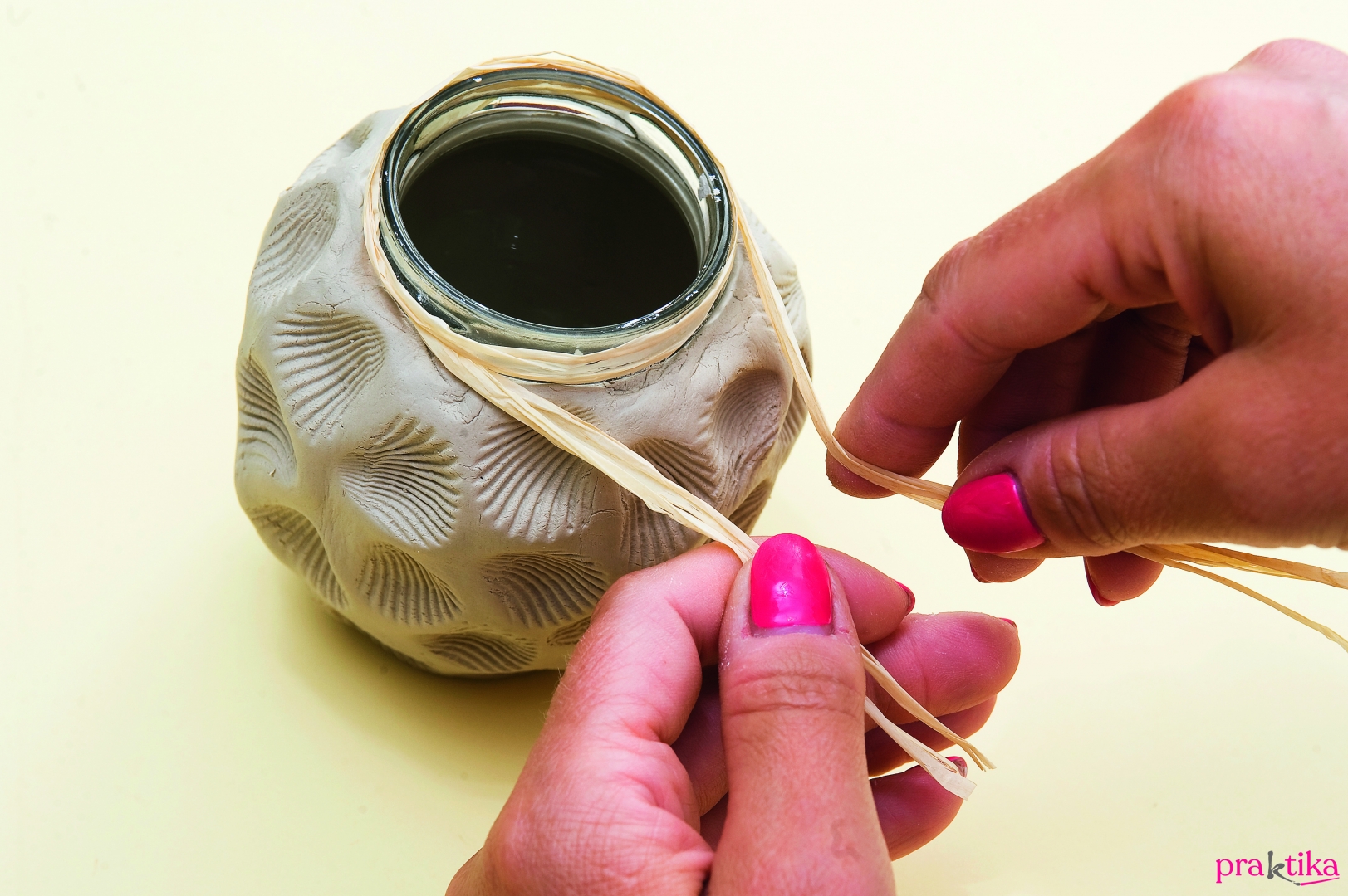 - Hagyd hófehérre száradni a gyurmát, ez 1-2 napig fog tartani. Végül kötözz a kész váza szájára rafiát.