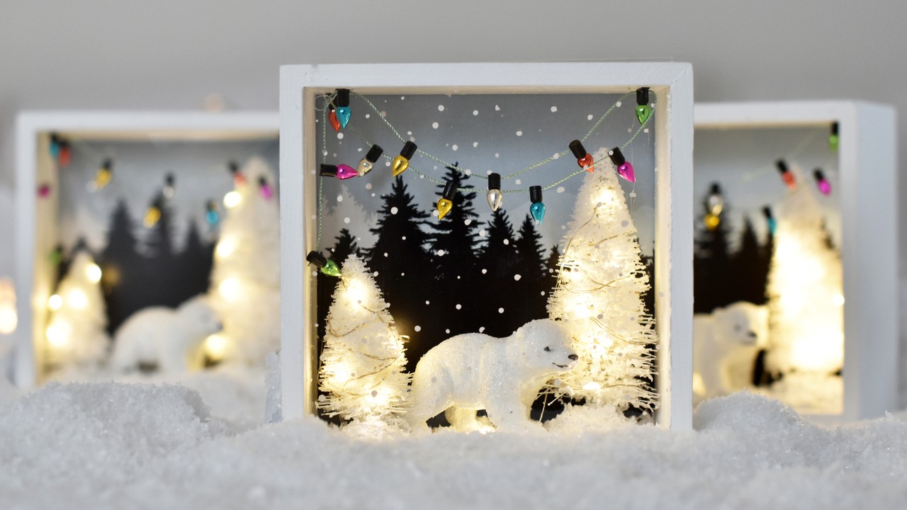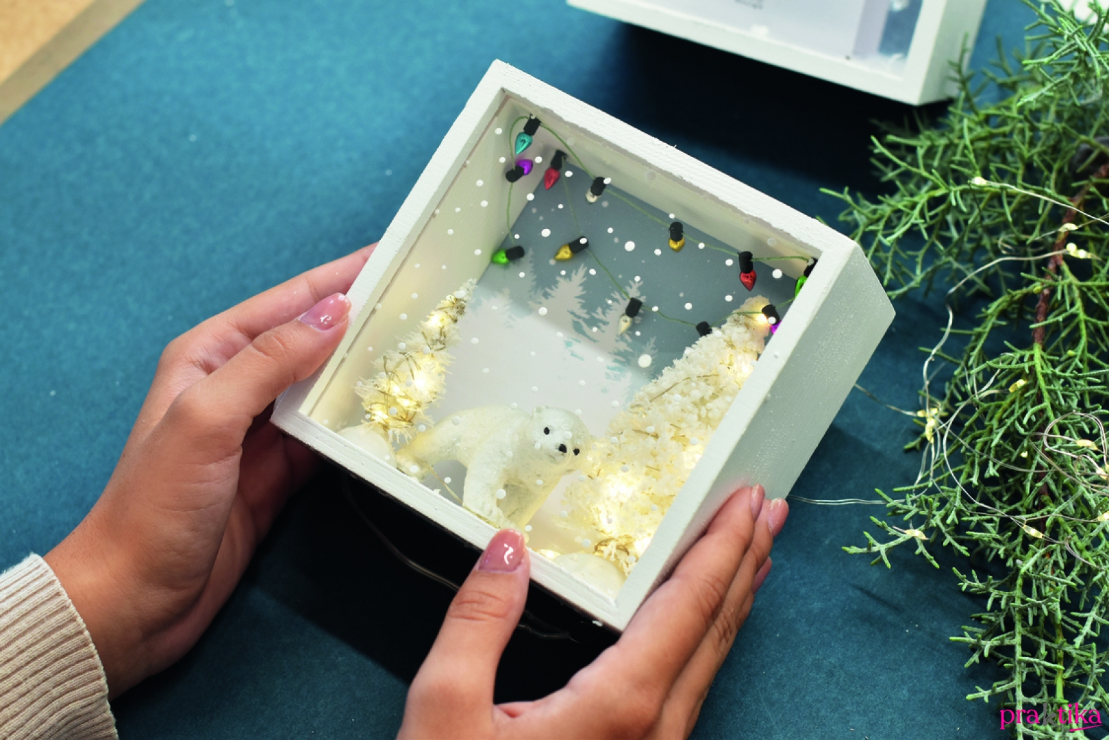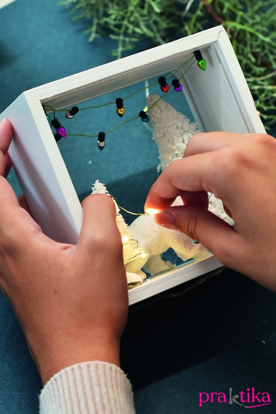 - Kis kétoldalú ragasztódarabkákkal rögzítsd a doboz alsó felébe a fenyőfákat két oldalra, a jegesmacit pedig középre. Tekerd körbe a fenyőfákat a LED- es égősorral. Tedd be a helyére a hátteret. A jegesmaci és a fenyőfák köré tetszés szerint szórhatsz műhavat. Végül tedd be a plexilapot a helyére.