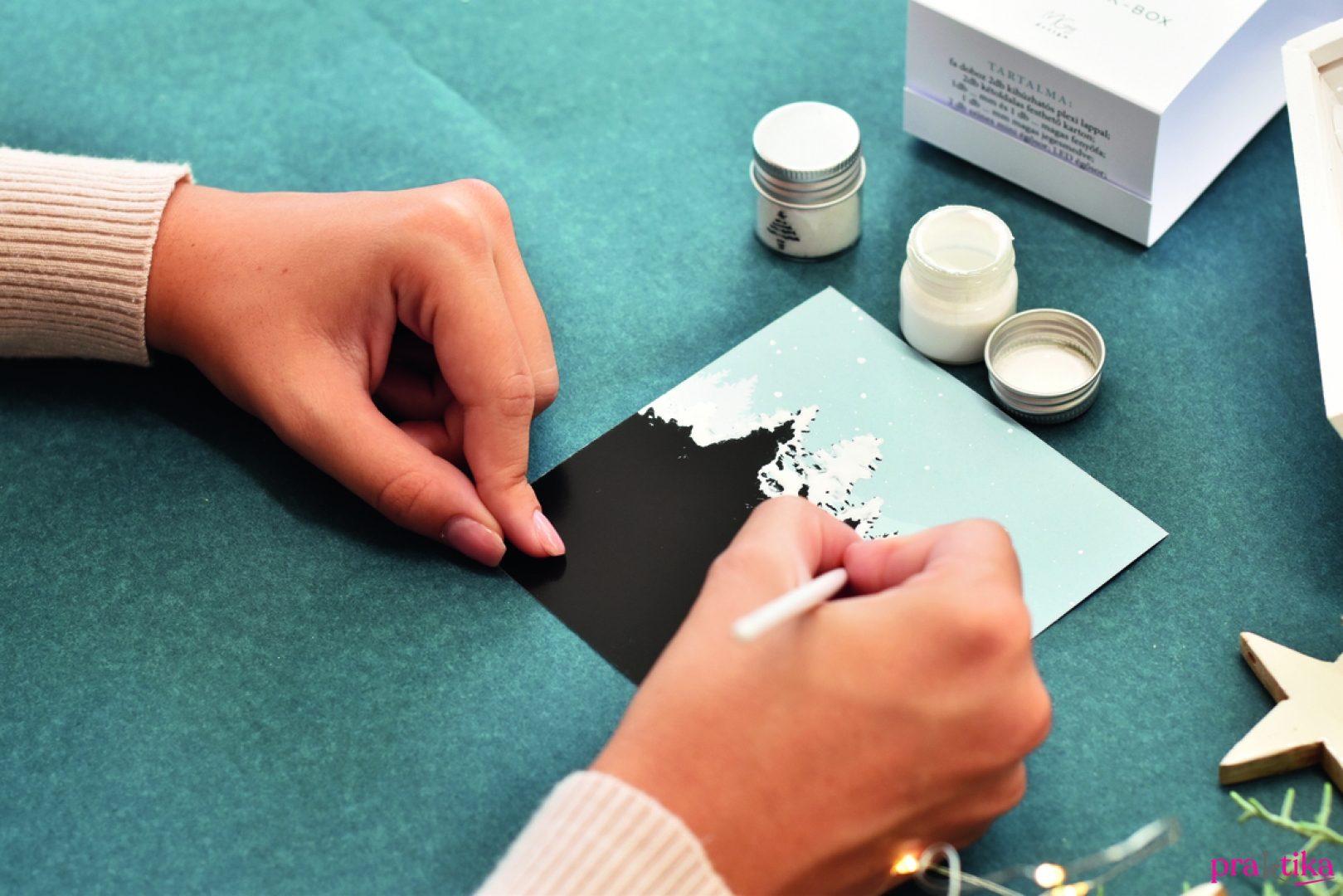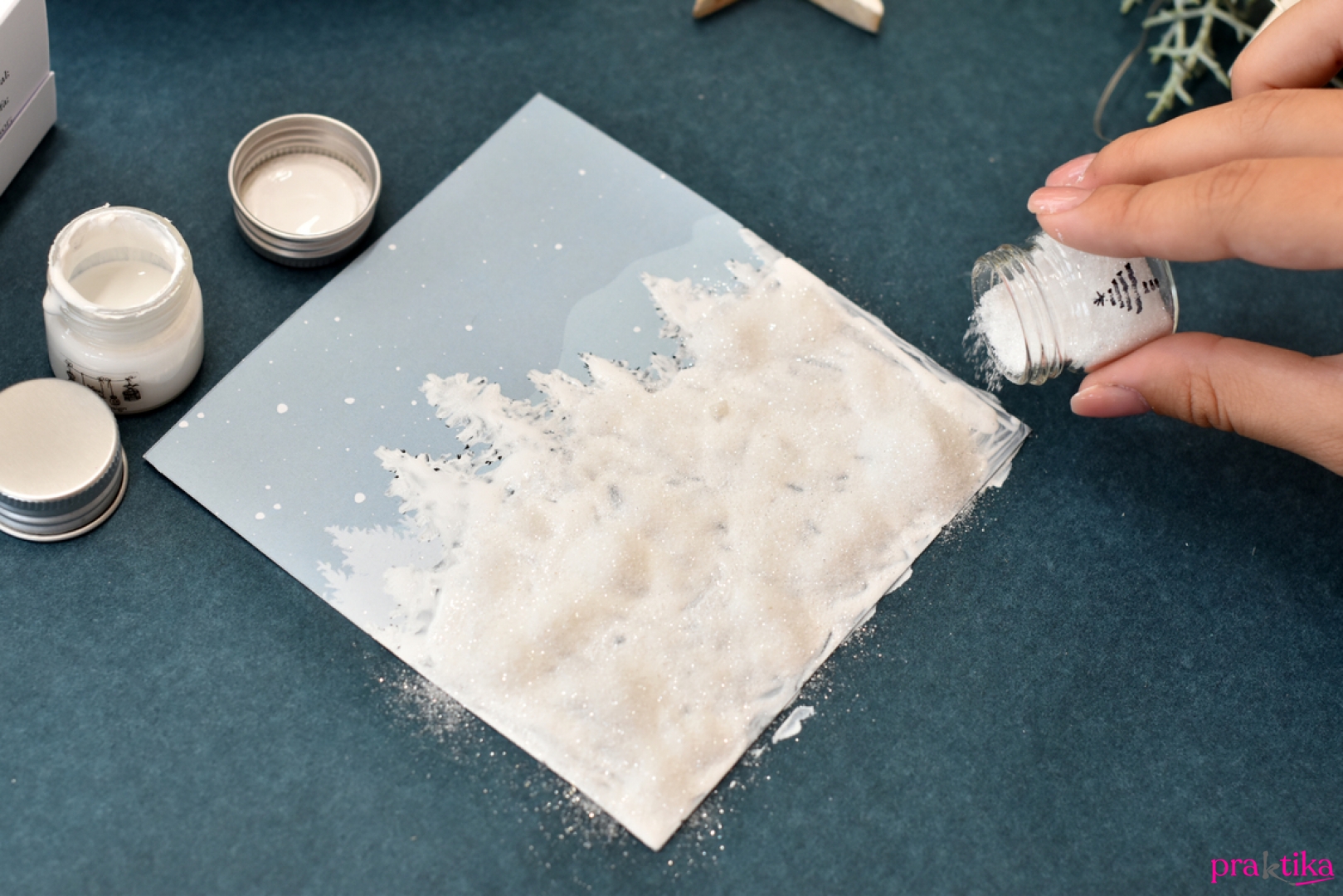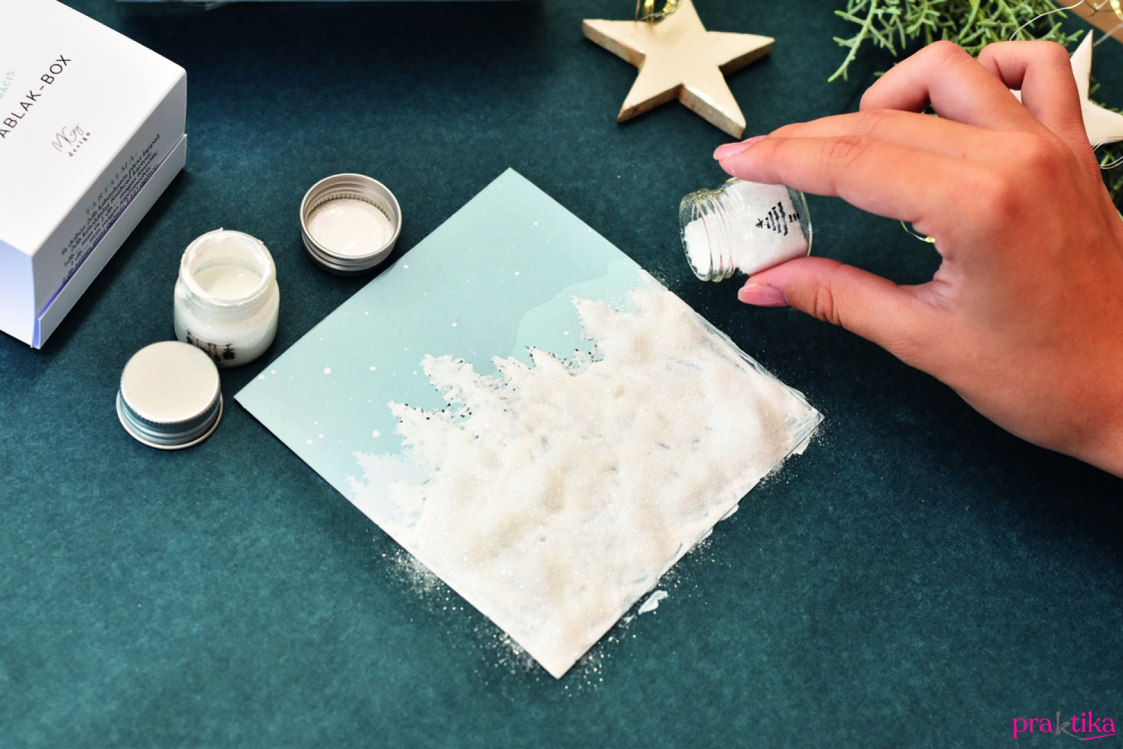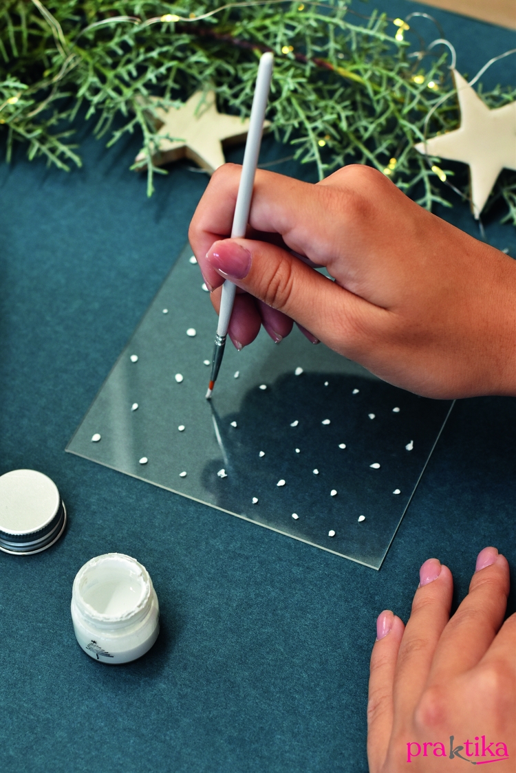 - A hátlapkartonra fess fel fehér fenyőfákat vagy filccel rajzolj rá feketéket, ahogy neked tetszik. Vékony ecsettel pöttyints az égboltra néhány hópöttyöt. Ha hozzánk hasonlóan a fehér fás verziót választottad, mielőtt megszáradna a festék, vastagon szórd be a fákat csillámporral, majd állítsd a kartont függőlegesen, és finoman ütögesd le róla a felesleget.