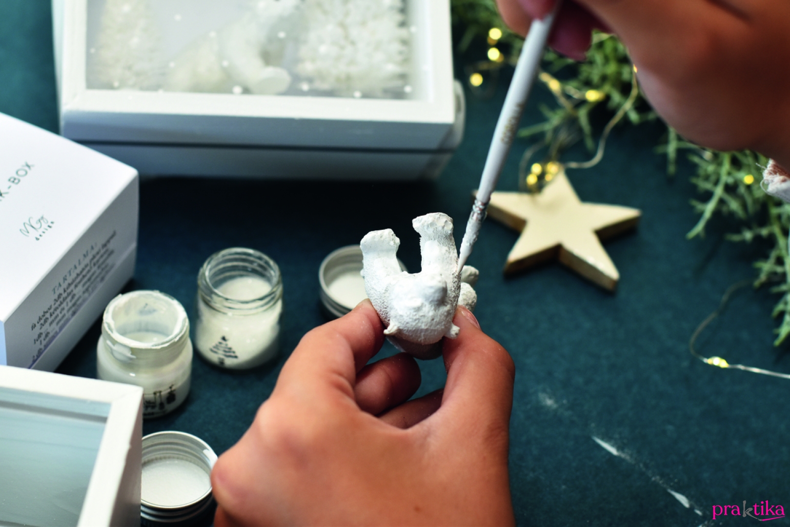 - Vedd ki a dobozból a plexilapot, továbbá a hátlapot, és kívül-belül fesd le a dobozt fehérre a lapos ecset segítségével. Hagyd megszáradni a festéket. A vékony ecsettel pöttyözd be fehér festékkel a plexilapot, és hagyd megszáradni.
