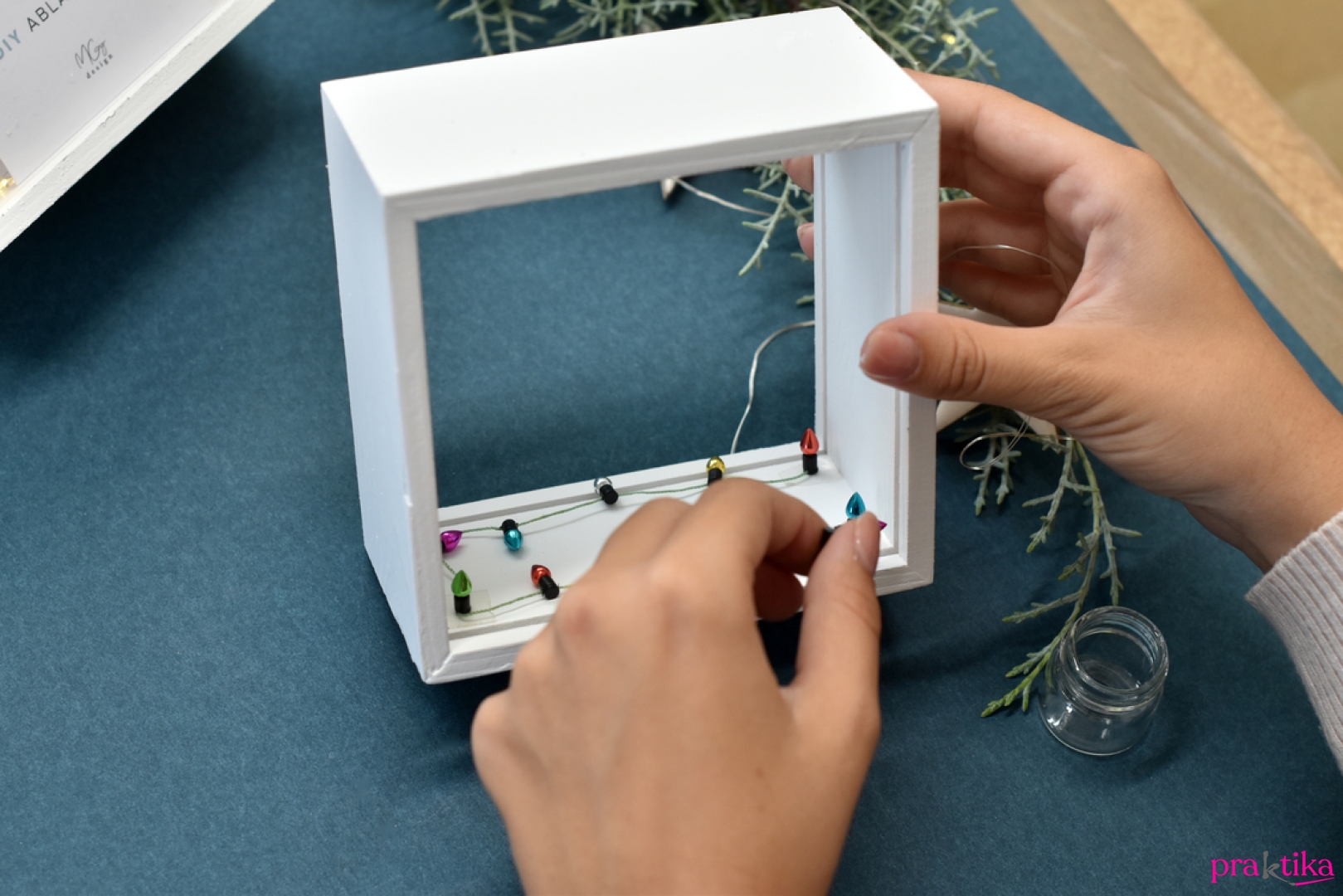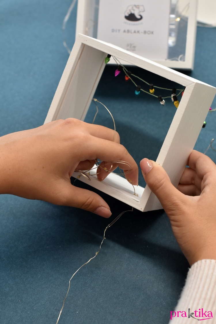 - Melegragasztó vagy kis kétoldalú ragasztópöttyök segítségével rögzítsd a doboz felső felének négy sarkához a színes mini égősor pont odaeső lámpácskáit, így a többi szépen le fog lógni. Fúrj egy apró lyukat a doboz egyik hátsó sarkába, és fűzd át rajta a LED-es égő- sort.