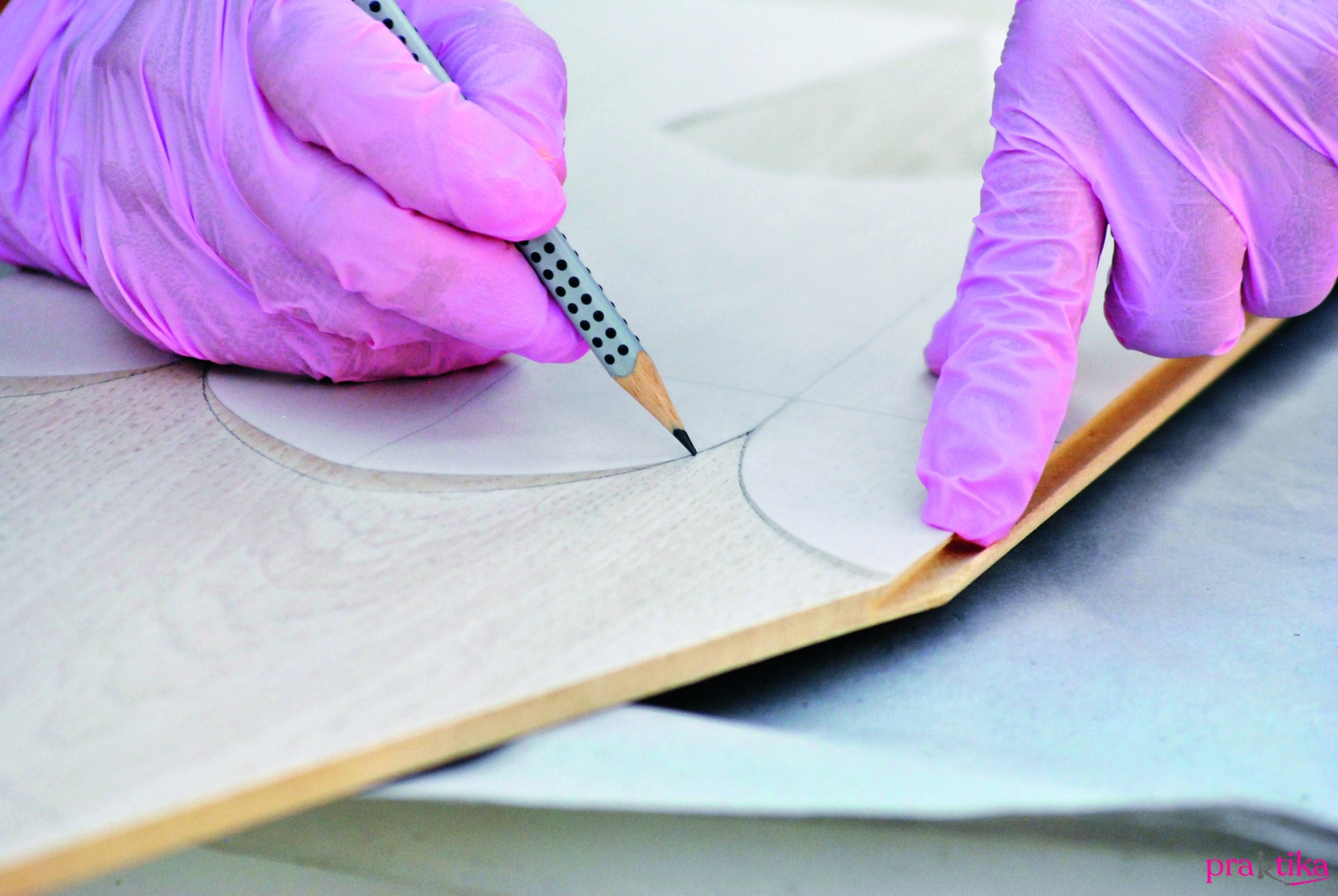 - Mérd meg az egyik parkettalap szélességét. Vágj egy ilyen széles darab pauszpapírt, és a két szélére rajzolj fel egy egynegyed-, közéjük pedig egy félkörívet. Vágd ki. Helyezd a parkettalapokra, és rajzold körül. Rajzold meg a ceruzák hegyét is.