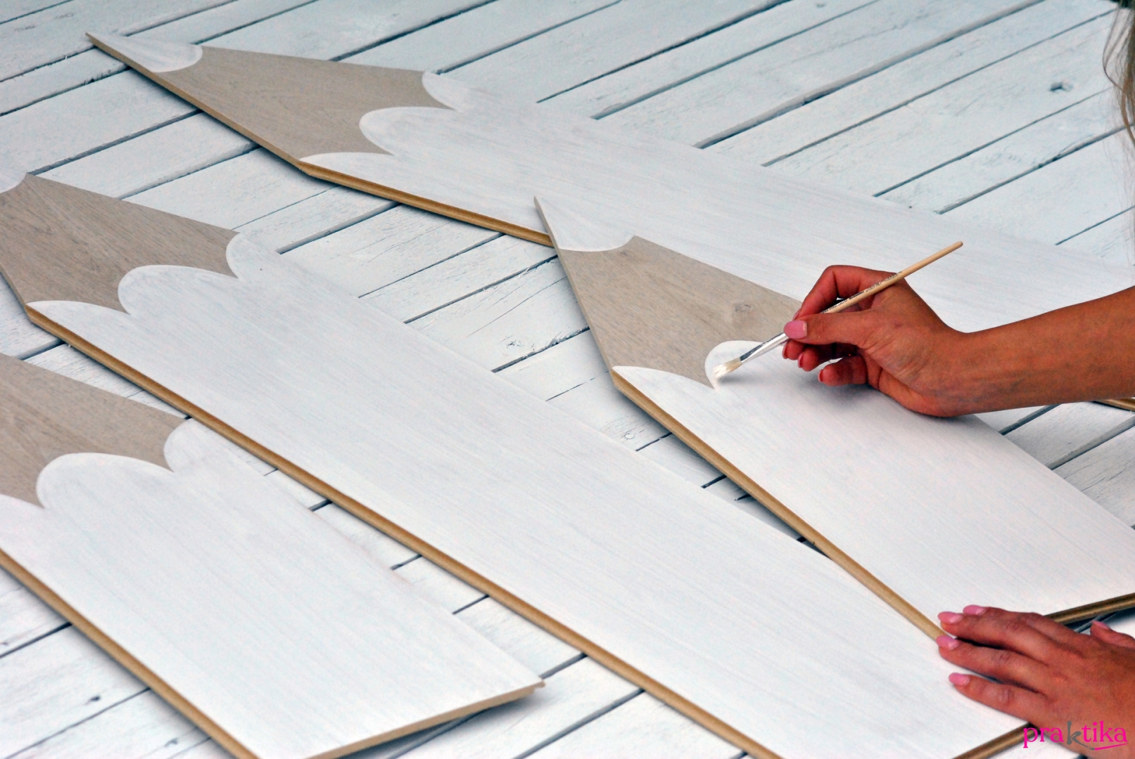 - Állítva tedd le magad elé az egyik parkettalapot, és attól függően, milyen magas ceruzát szeretnél, mérd ki a közép pontját. A parketta két szélétől húzz ide egy-egy átlós vonalat vonalzó segítségével, majd ezek mentén vágd le a felesleges részeket dekopírfűrésszel. Csiszolóvászonnal csiszold finomra a vágások széleit, nehogy megsérüljön majd a gyermeked. Ugyanígy készíts még három ceruzát, kisebbet és nagyobbat egyaránt.