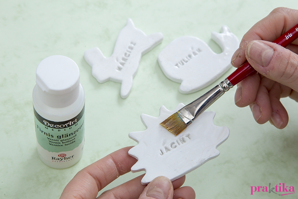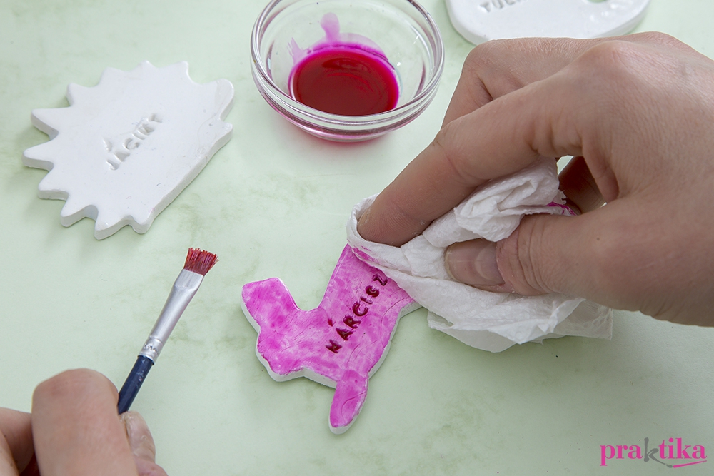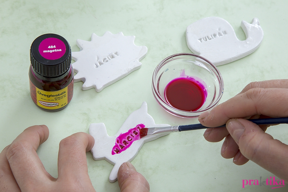 Hagyd egy napot száradni a figurákat, de néha fordítsd meg, hogy száradás közben ne görbüljenek meg. Ha teljesen szárazak, kicsit csiszold meg a széleiken található egyenetlenségeket. Kend át mindkét oldalukat hobbilakkal. Ha nem érzed elég csúszósnak a felületet, nyugodtan kend át még egyszer. Kenj a feliratra bőven üvegfestéket, hogy a mélyedésekbe befolyjon, majd az ecset segítségével a maradékot is oszlasd el egyenletesen a felületen. Egy papírtörlővel töröld át, így nagyobb lesz a kontraszt a betűk, és az alap színe között. Hagyd a festéket megszáradni, de vigyázz, az oldószeres festék lassabban szárad, mint a vízbázisú.