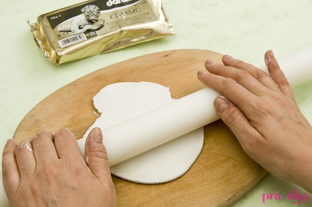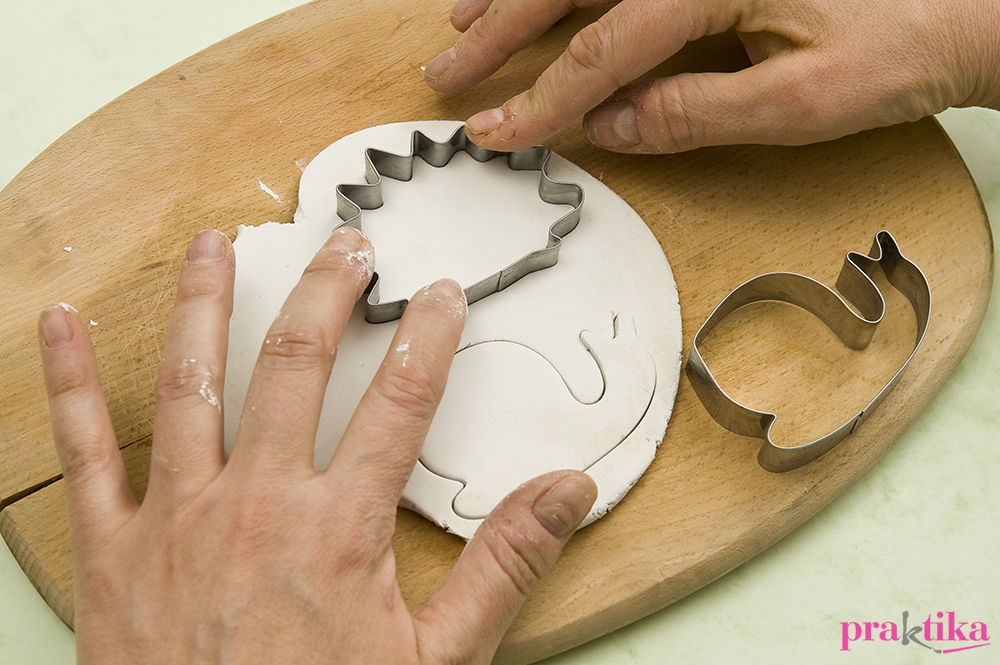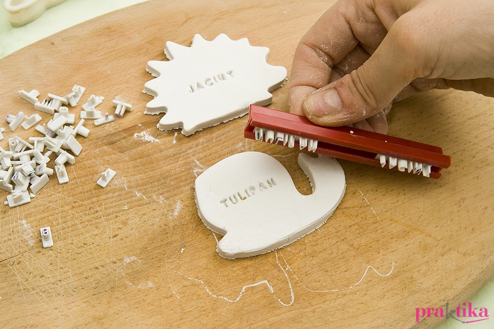 Nyújtsd ki a gyurmát fél cm vastagságúra, majd szaggasd ki a formákat sütikiszúróval. Helyezd a betűnyomdába a megfelelő felirat tükörképét, majd csinálj egy próbanyomást egy darab gyurmán, hogy minden betűt helyesen tettél-e be. Nyomdázd meg a figurákat.