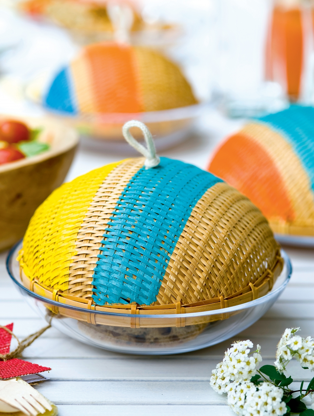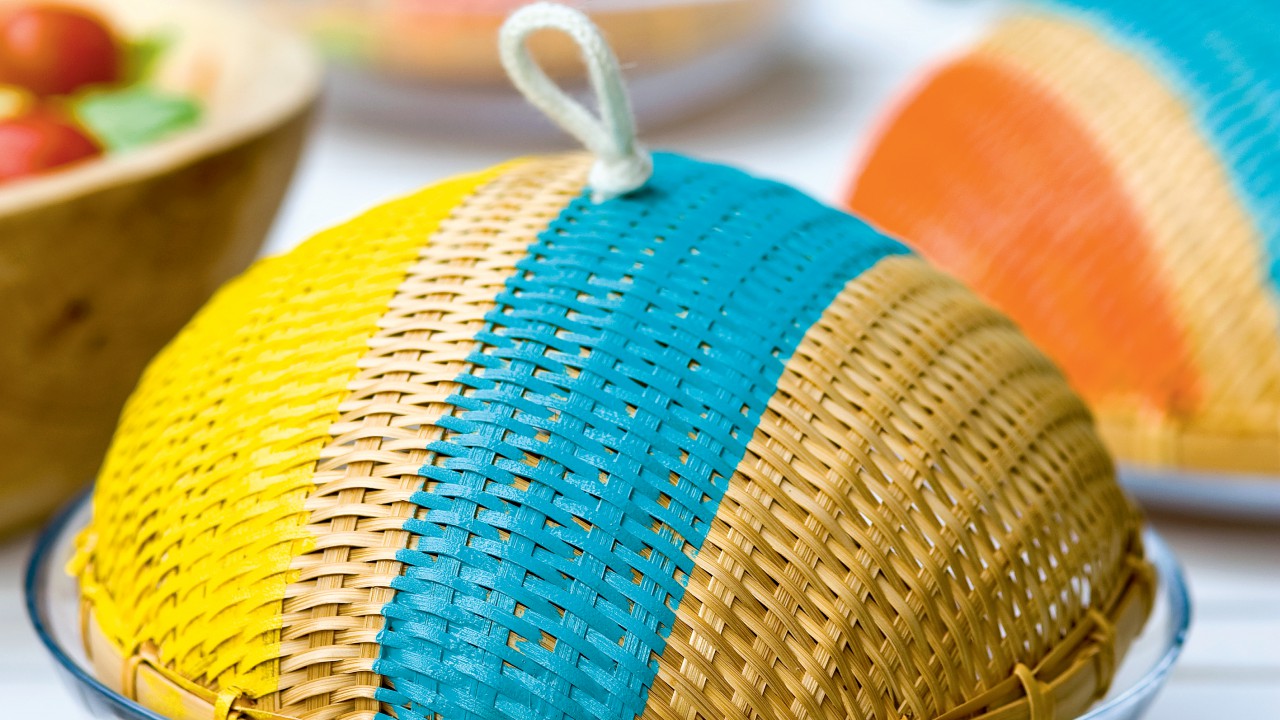 A fonott kosárkákat festés után alakítsd át ételvédő burákká! Csomózz rájuk zsinórfüleket, és máris ráfordíthatod a tányérokra.