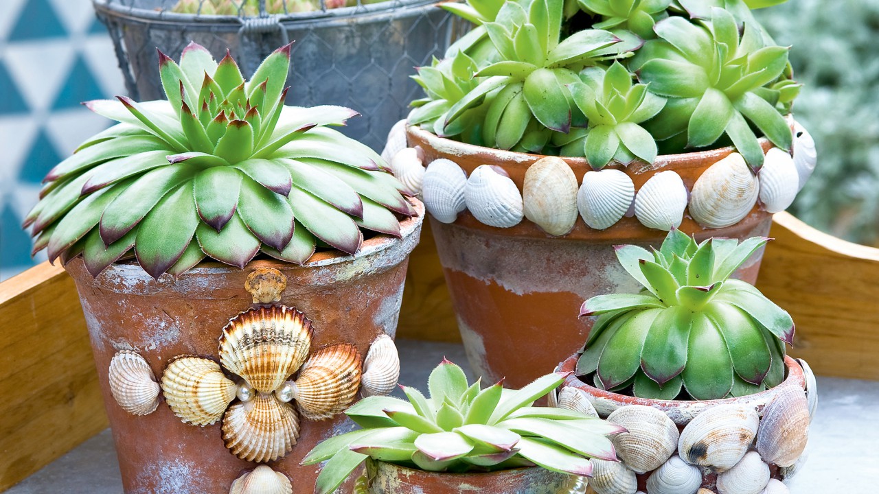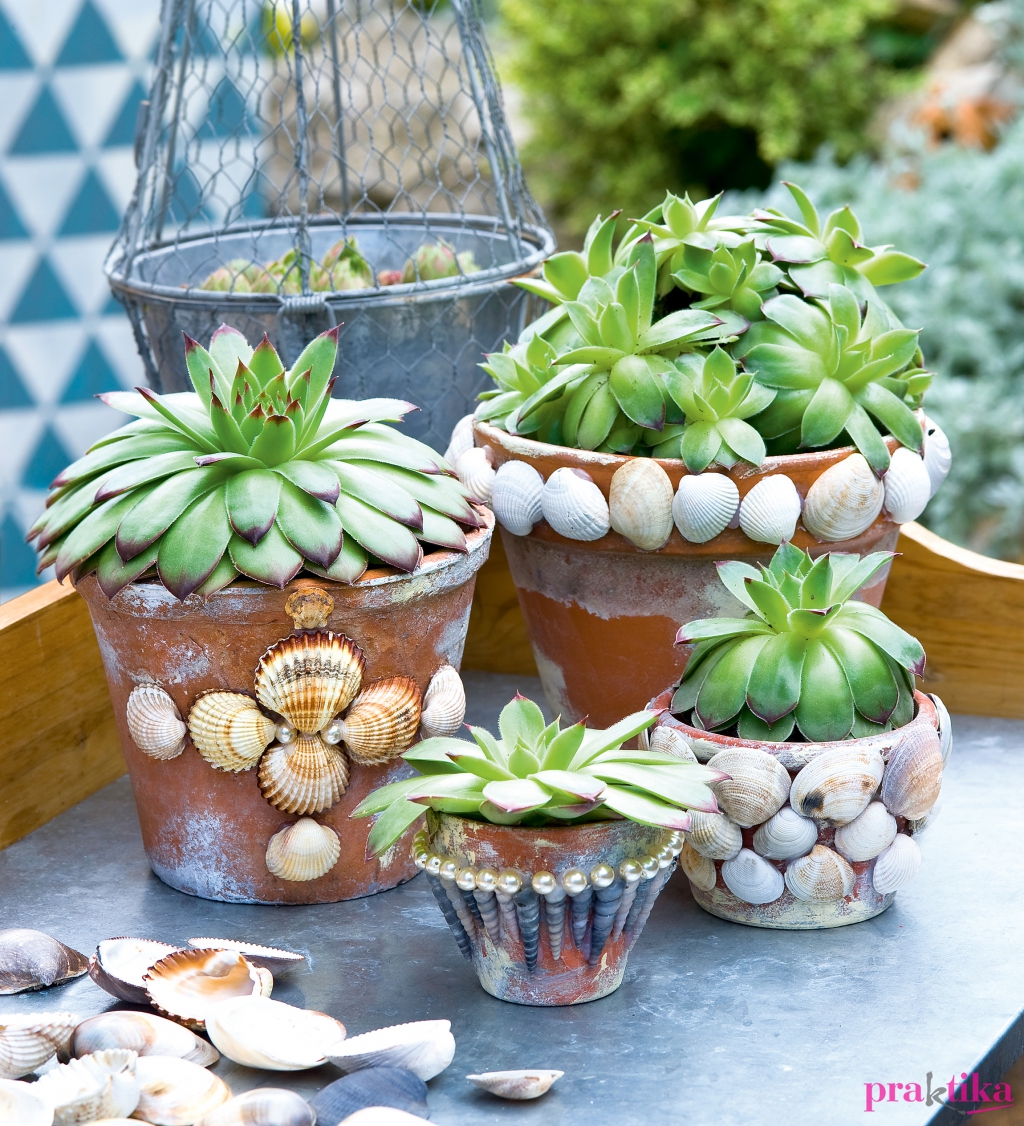 Az új cserepekből hamar lesz ódon darab, ha akrilfestékkel, száraz ecsettel szürke és drapp foltokat festesz rájuk. Utána melegragasztóval erősítsd fel a cserépre a kagylóhéjakat és csigaházkat a neked tetsző elrendezésben. Néhány szem csillogó, fehér tekla gyönggyel is kiegészítheted a dekorációt.