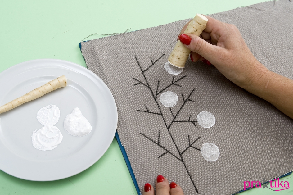 - Nyomj némi fehér textilfestéket egy tányérba, és mártsd bele a legnagyobb átmérőjű zöldségnyomdát. Tunkold is bele egy kicsit, hogy a festék egyenletesen eloszoljon a nyomófelületen, majd pecsételj az egyik ág végére. Minden pötty elkészítése előtt tunkold újra a festékbe a répadarabot.