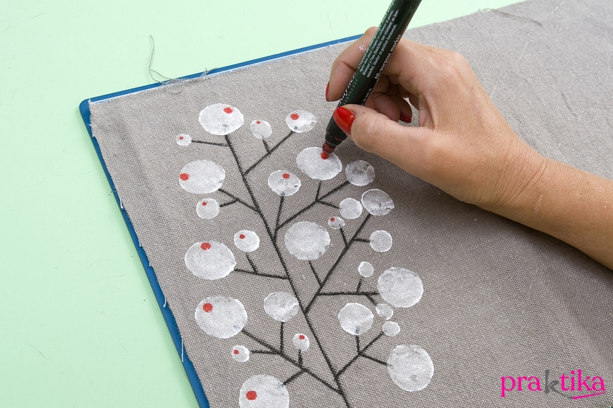 - Minden fehér bogyóra készíts egy-egy pöttyöt piros textilfilctollal, hogy részletgazdagabb legyen a minta, majd a textilfesték használati utasítása szerint vasalóval rögzítsd a mintát az anyagba.