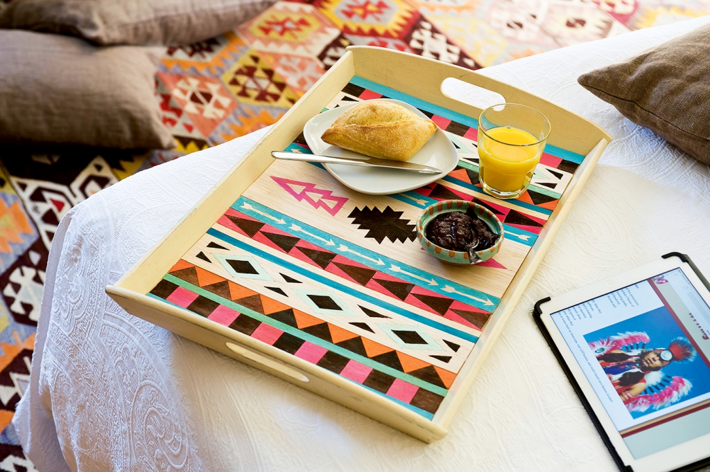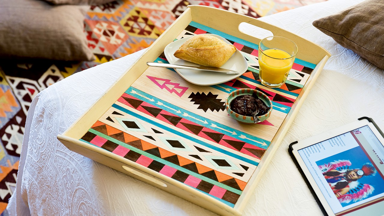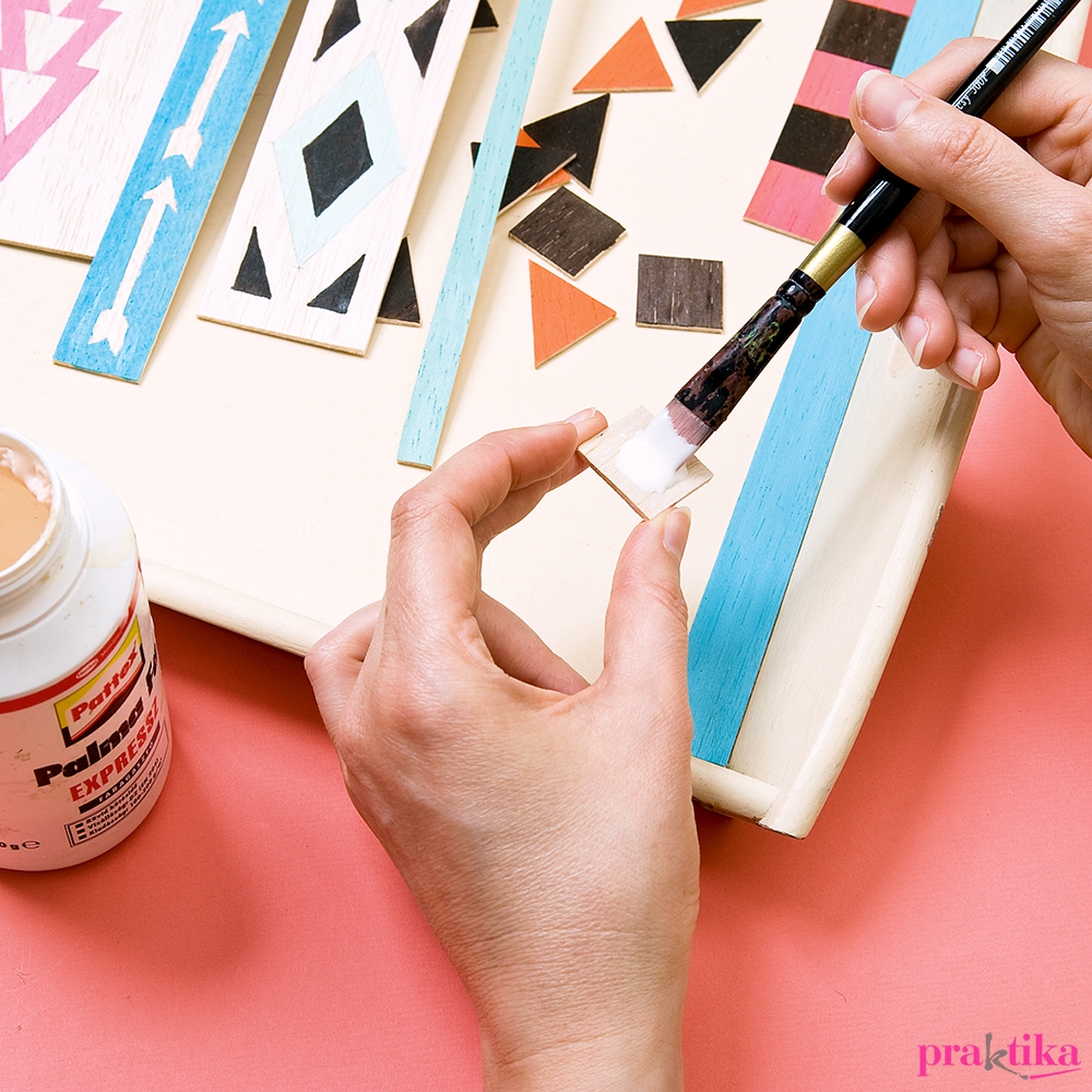 Tervezd meg a mintát és rajzold fel a balsafára. A különböző méretű lécekből sniccerrel vágd ki a minta darabjait. Fesd egyszínűre a darabkákat. Tartsd meg a vágás sorrendjét, hogy könnyebben tudd összálítani a végén a mintát. Ragaszd fel az elemekt a tálcára faragasztóval. Száradás után kend át matt lakkal.