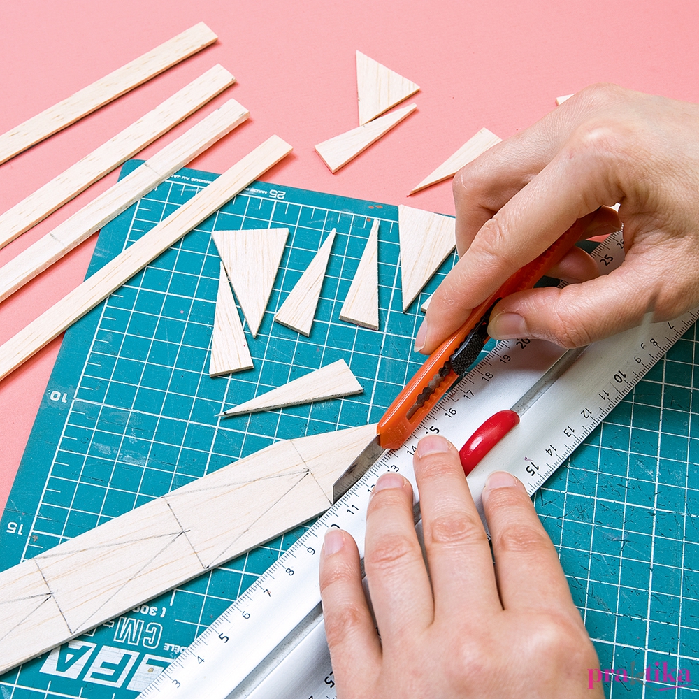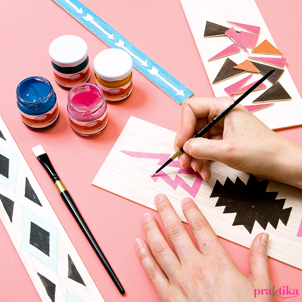 Hozzávalók • nagy méretű fatálca • különböző szélességű, de azonos vastagságú balsaléc • színes akrilfesték • ecset • ceruza • vonalzó • sniccer • faragasztó • hobbilakk