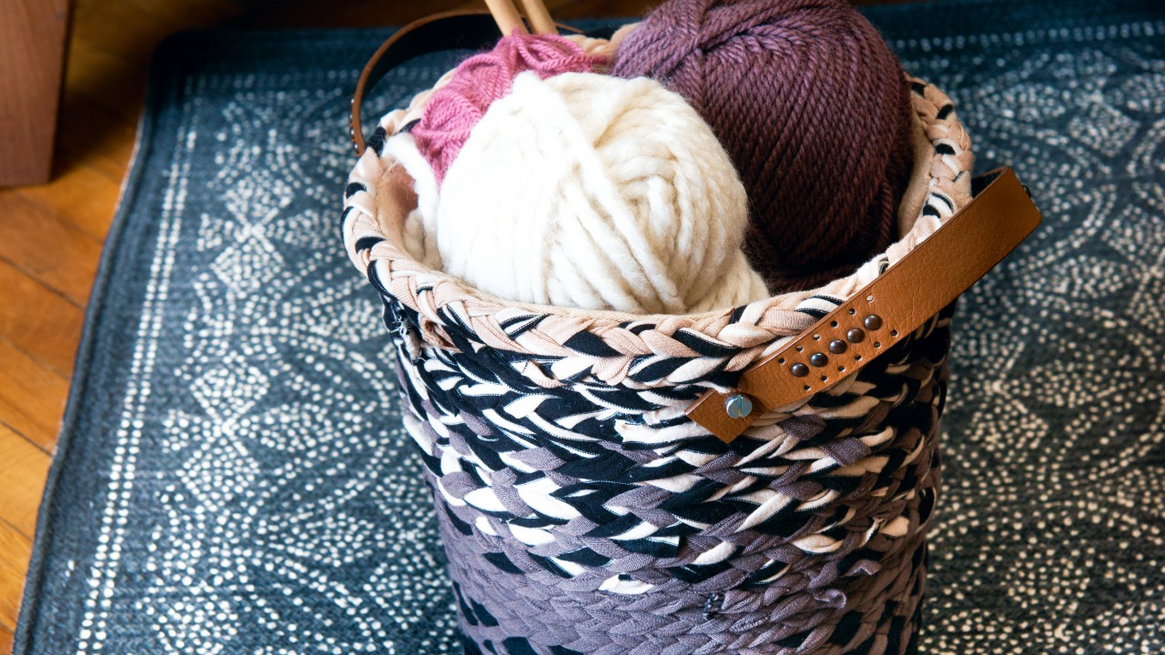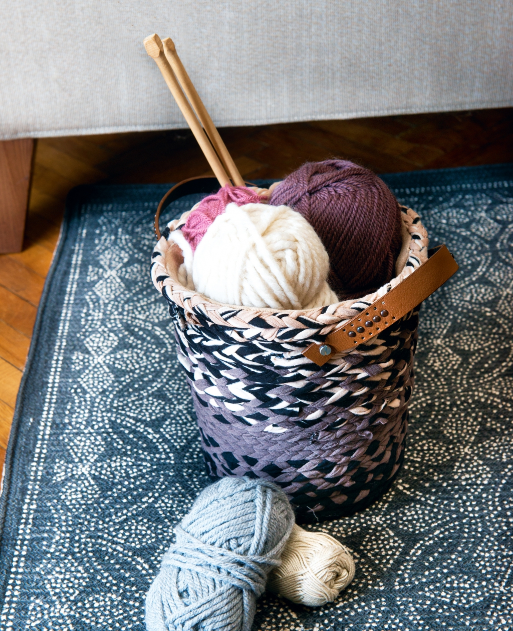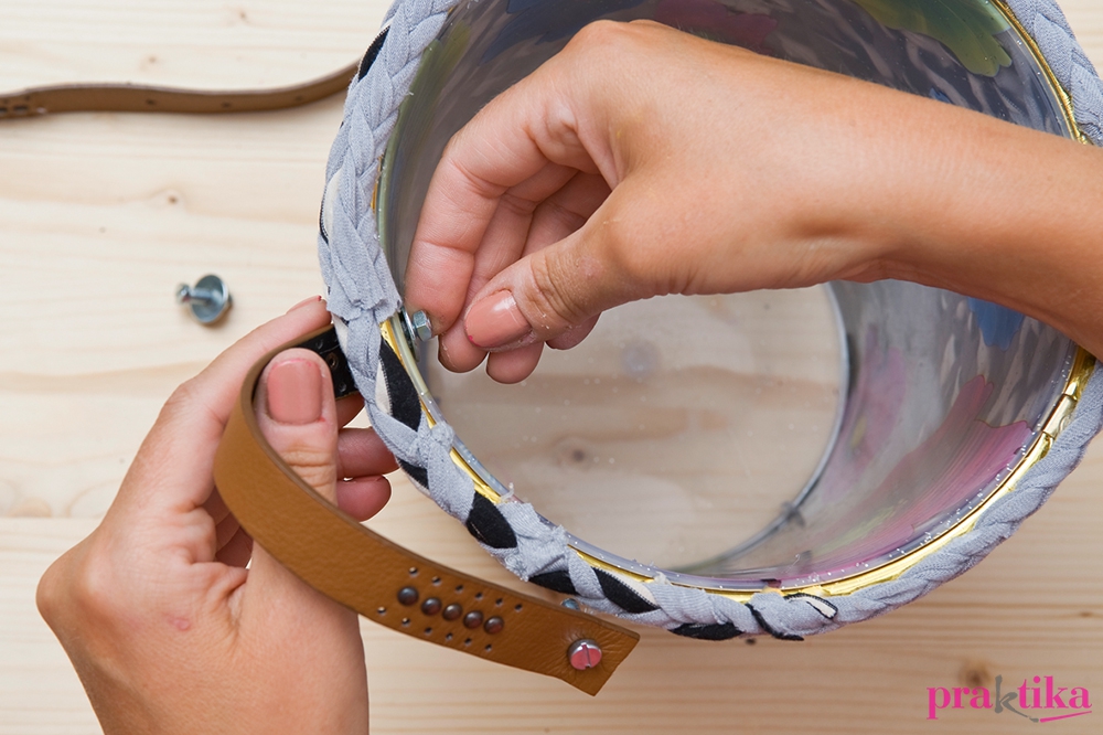 A hosszú fonat elejét rögzítsd a műanyag kosár aljához, és a kezdő csomót vágd le, hogy ne dudorodjon ki. Kezdd el feltekerni a kosár oldalára a fonatot, 10-15 cm-enként egy-egy pötty forró ragasztóval rögzítsd. Egészen a felső peremig vond be a kosarat. Jelölj ki két-két pontot a fogantyúnak a kosár belső oldalán, fúrd át és csavarozd fel a két bőrszíjat. Ha van kedved, bélést is készíthetsz a kosárba.