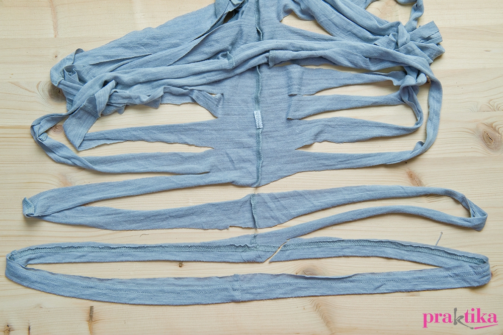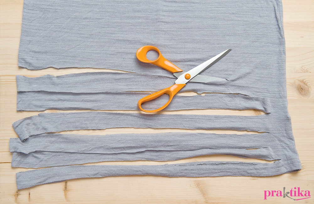 Teríts ki egy pólót, és vágd be keresztben 5 cm-enként az aljával párhuzamosan, de ne végig. Fektesd le úgy, hogy az oldal, amit nem vágtál be, középen legyen szépen kisimítva, és először az aljától vágj ferdén fel az első vágásvonalig, majd ismételd ezt folyamatosan felfelé haladva az egyik vágásvégtől a következő vágáskezdetig. Így egy folyamatos pólófonalat kapsz, amit gombolyíts fel.