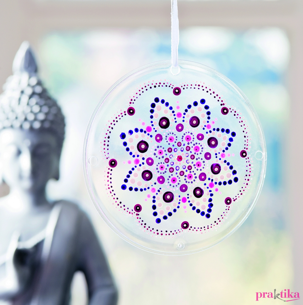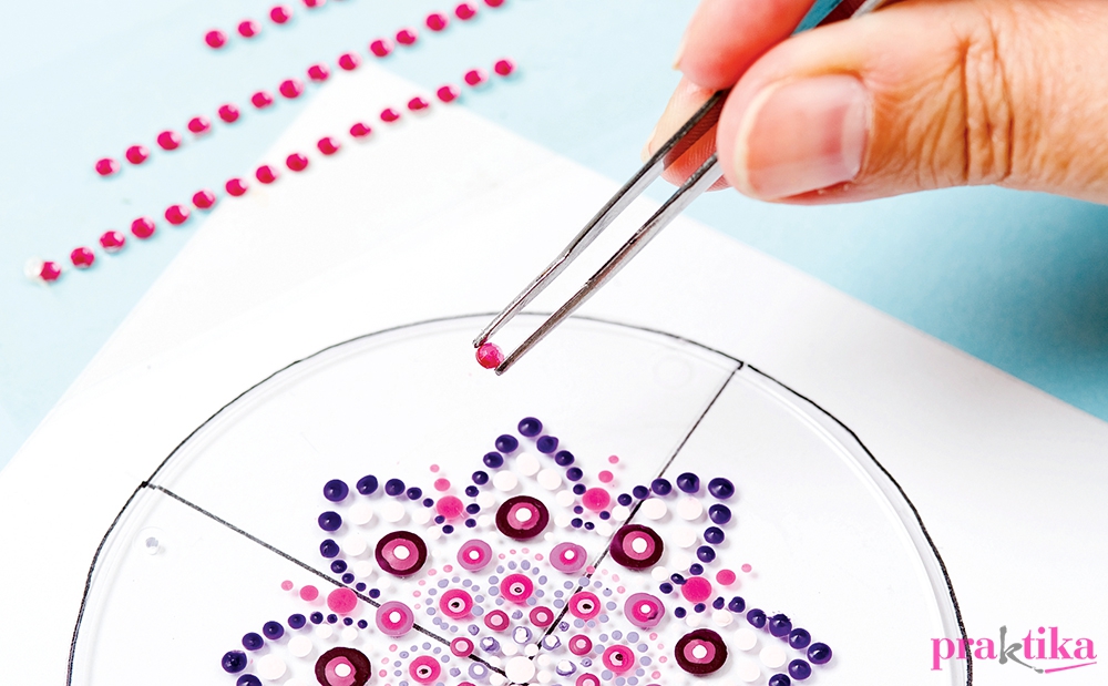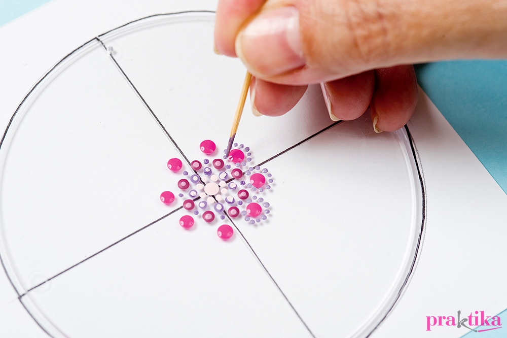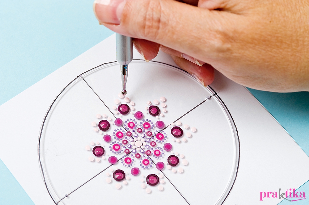 A pöttyöket körbeveheted sziromszerű formákkal is. A szimmetria tartásához segítségedre lesznek a vonalak. Az eltérő méretű pontokat úgy is megfestheted, ha a kisebbeknél alig érinted le az eszköz hegyét, de a nagyobbaknál jobban. Bővítsd tetszés szerint körben a madalát. Sugárirányban festhetsz egyre kisebb pöttyökből álló sort. A középpontba ragassz egy szem strasszkövet.