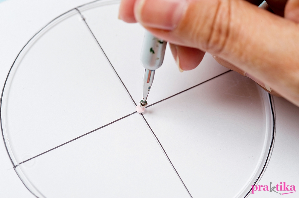 Rajzold körbe a papíron a műanyag lapot és húzd meg a kör két átmérőjét is, egymásra merőlegesen. A metszéspont lesz a mandala középpontja. Helyezd rá a műanyag lapot a sablonra, és hogy ne mozduljon el, ragasztószalaggal rögzítsd. Jelöld a középpontot egy festékpöttyel.