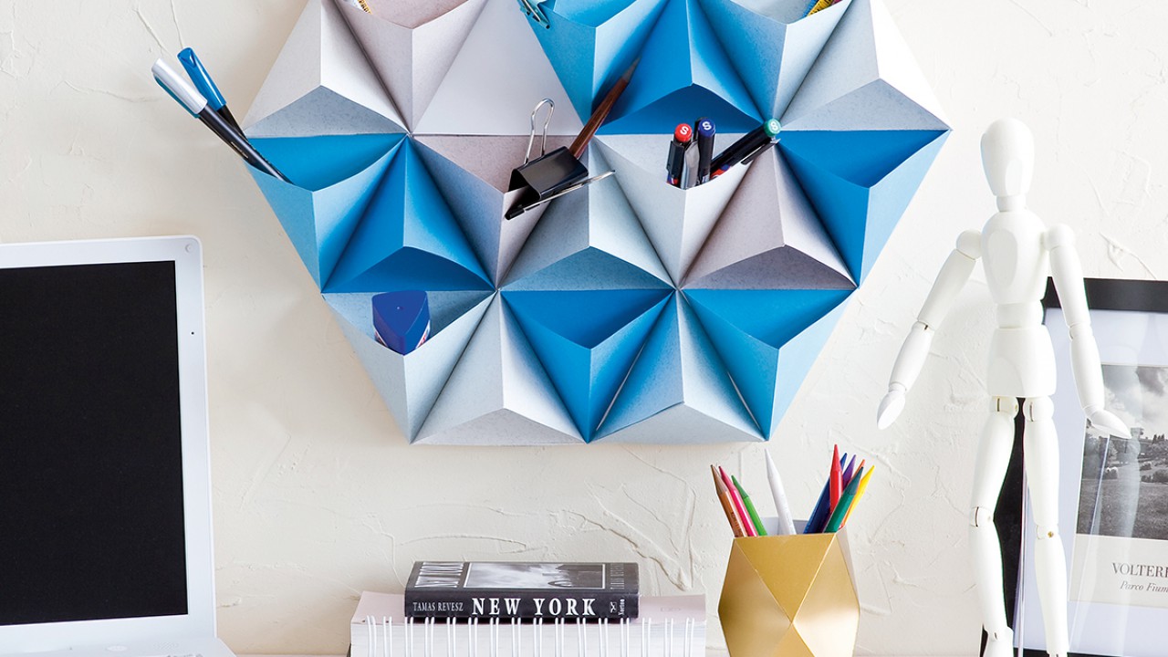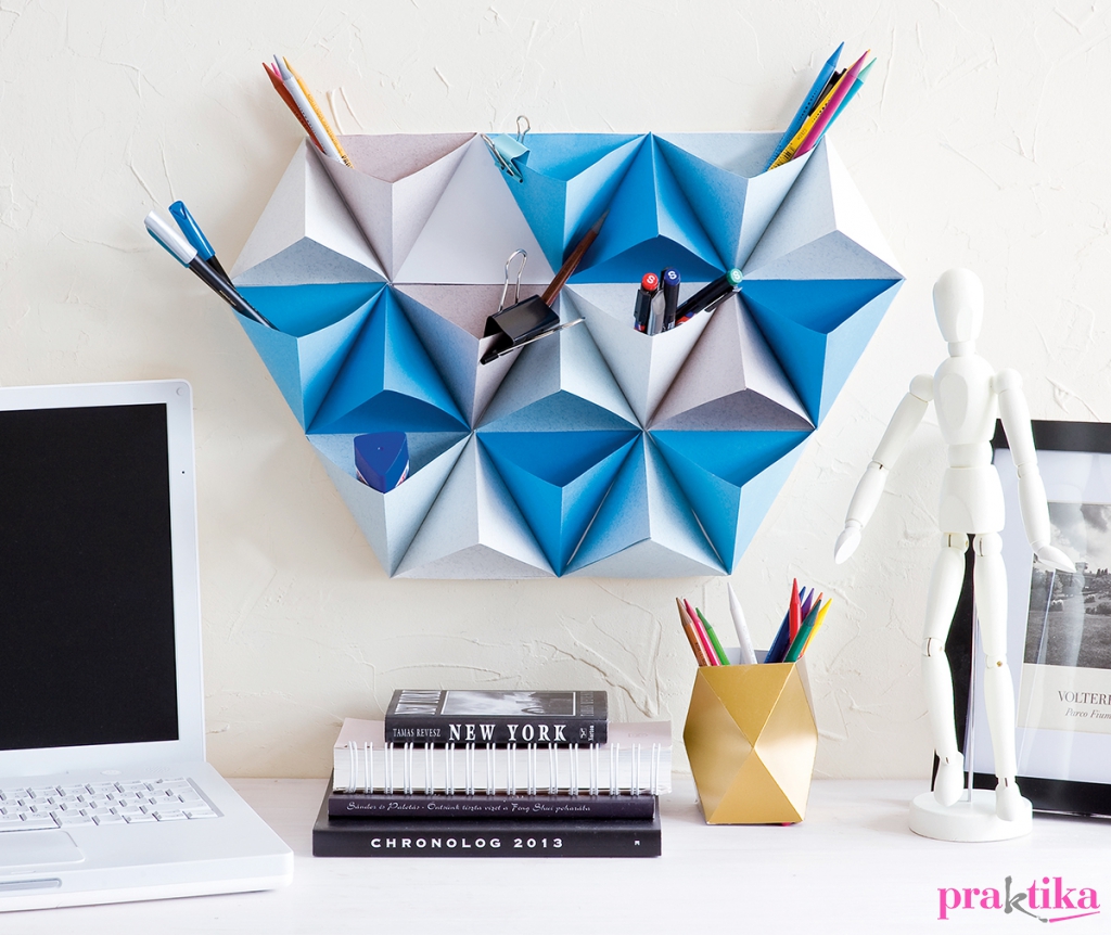 Rendezd el a gúlákat a habkartonon, ahogy a képen látod, és egyenként ragaszd fel melegragasztóval. Sniccerrel vágd le a felesleges habkartont, és két szöggel rögzítsd a falra a tárolót, ami egyben egy modern falikép is.