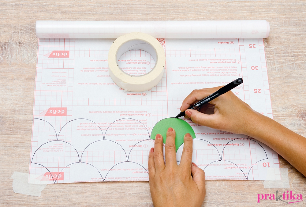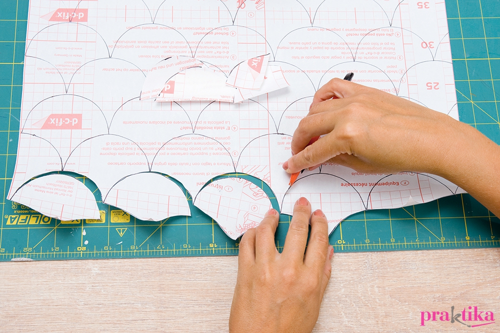 Vágd ki a pikkelymintát a kartonlapból, majd rajzold körbe a fólia hátoldalán többször, pontosan egymás mellé iilesztve. Sniccerrel szabd ki az elemeket. A szélenél lehulló fél darabokat se dobd ki, mert ezekre szükség lesz az ablak kereténél.