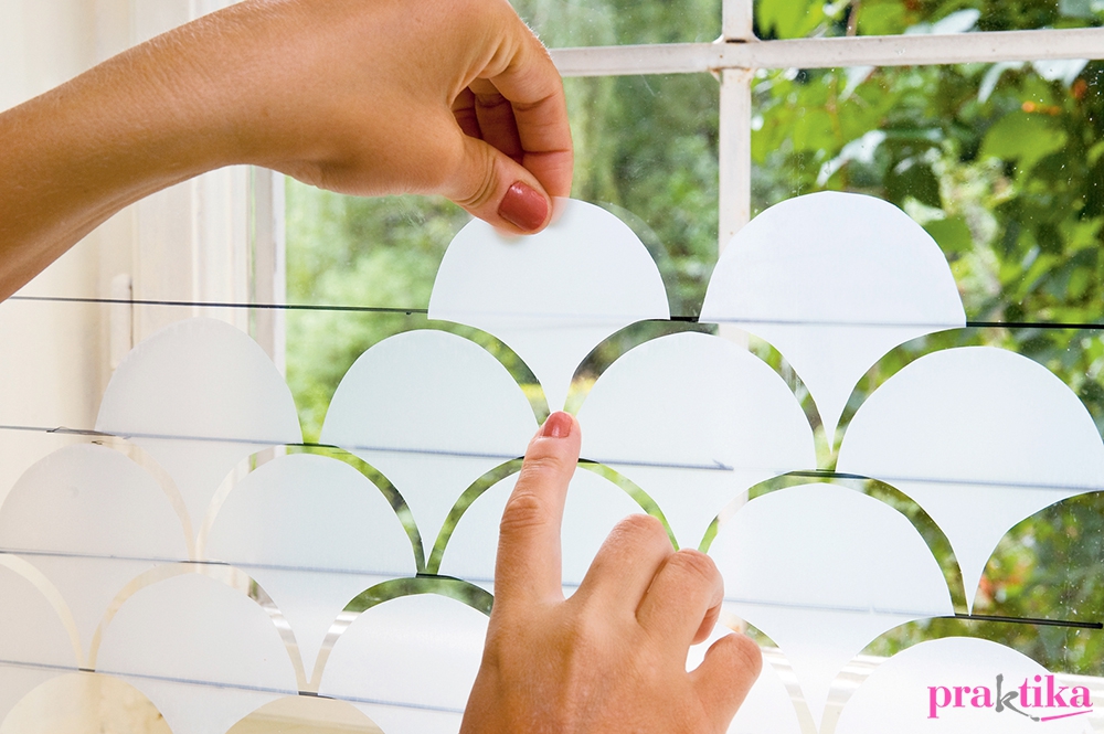 Ragaszd fel az első sort úgy, hogy az alsó csücskök mind pontosan az ablakkeret aljához illeszkedjenek, és mindkét oldalon legyen az elemek között egy keskeny rés. Ha a következő sor első elemét a helyére illesztetted, húzz az ablak túloldalán alkoholos filccel egy segésdvonalat a keret aljával párhuzamosan. Ez segít a további elemek pontos elhelyezésében. Töltsd fel további pikkelyekkel a megfelelő magasságig a felületet. Az üvegről acetonos vattával tudod letörölni a segédvonalakat.