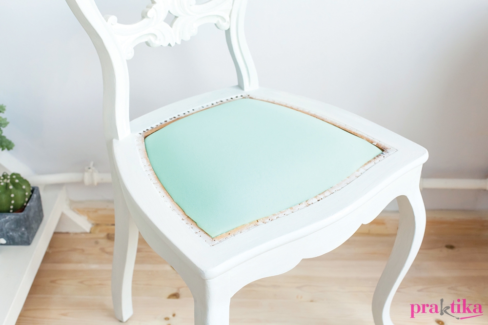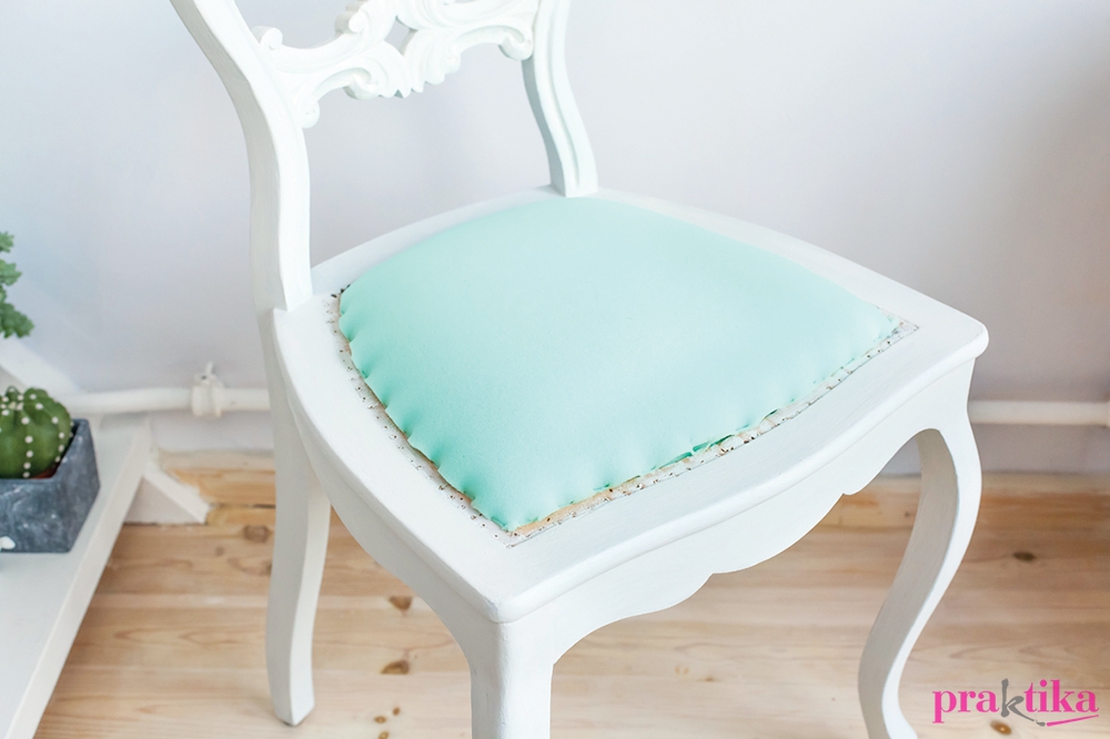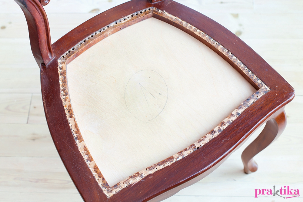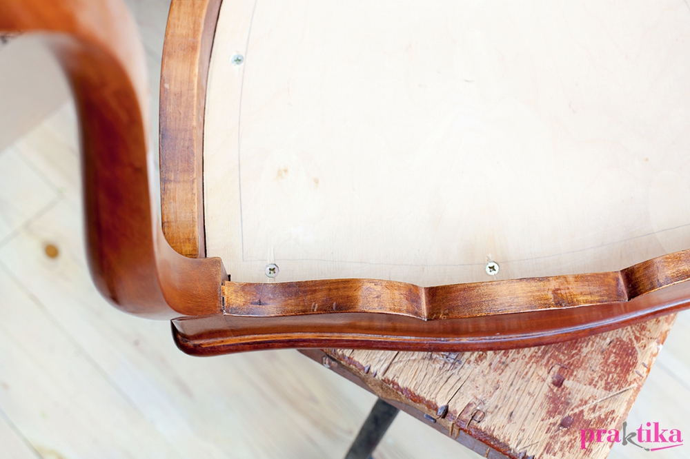 A széket felfordítva az ülőfelület keretébe illeszkedő, 8-10 mm vastag rétegelt lemezt vágtunk, amit a keret alsó részéhez csavaroztunk alulról. A széket visszafordítottuk az eredeti állásába, most már jöhettek a kárpitozás rétegei. Azért mi még előbb lefestettük, hogy igazán új megjelenése legyen.