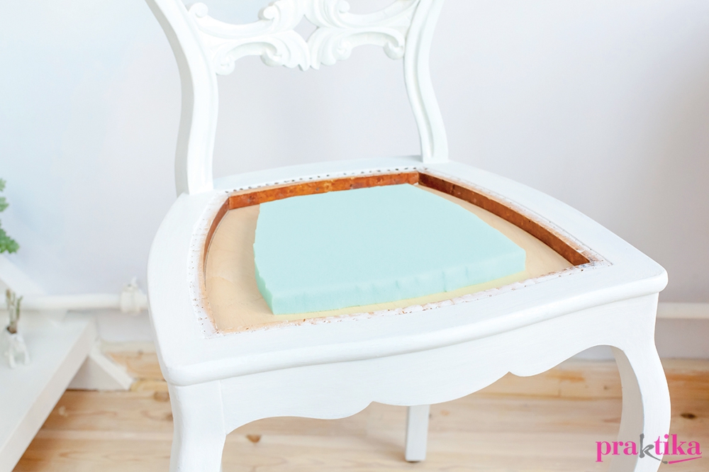 Ahhoz, hogy szép íves formát kapjunk, több szivacsréteget ragasztunk egymásra. 2 cm vastag szivaccsal dolgozunk, mert ezzel könnyű rétegezni. Az első szivacsot a szék ülőfelületének körvonalától 4 cm-rel kisebbre vágjuk és ráragasztjuk a rétegelt lemez alapra, középre. A szivacs ragasztásához csak szivacsragasztót használjunk, amit kárpitos kellék szaküzletekben lehet beszerezni, a többi ragasztó alkalmatlan erre a célra.