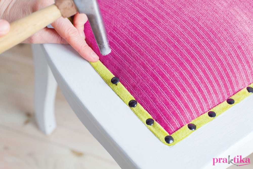 Vágjunk 2 cm széles csíkot a kiválasztott kárpitból, majd hajtsuk be a két szélét, hogy 1 cm széles csíkot kapjunk. Ha könnyen visszaugrik az anyagunk, összeölthetjük a hátulját laza öltésekkel, majd kivasalhatjuk, így biztos, hogy formatartó lesz. Ezt a szalagot díszszegekkel rögzítsük a kárpitozásunk szélére, a falcba, követve annak formáját. Amikor körbe ér, úgy dolgozzuk el, hogy a két vége egy díszszeg alá essen, így tökéletes megjelenésű kárpitozásunk lesz.