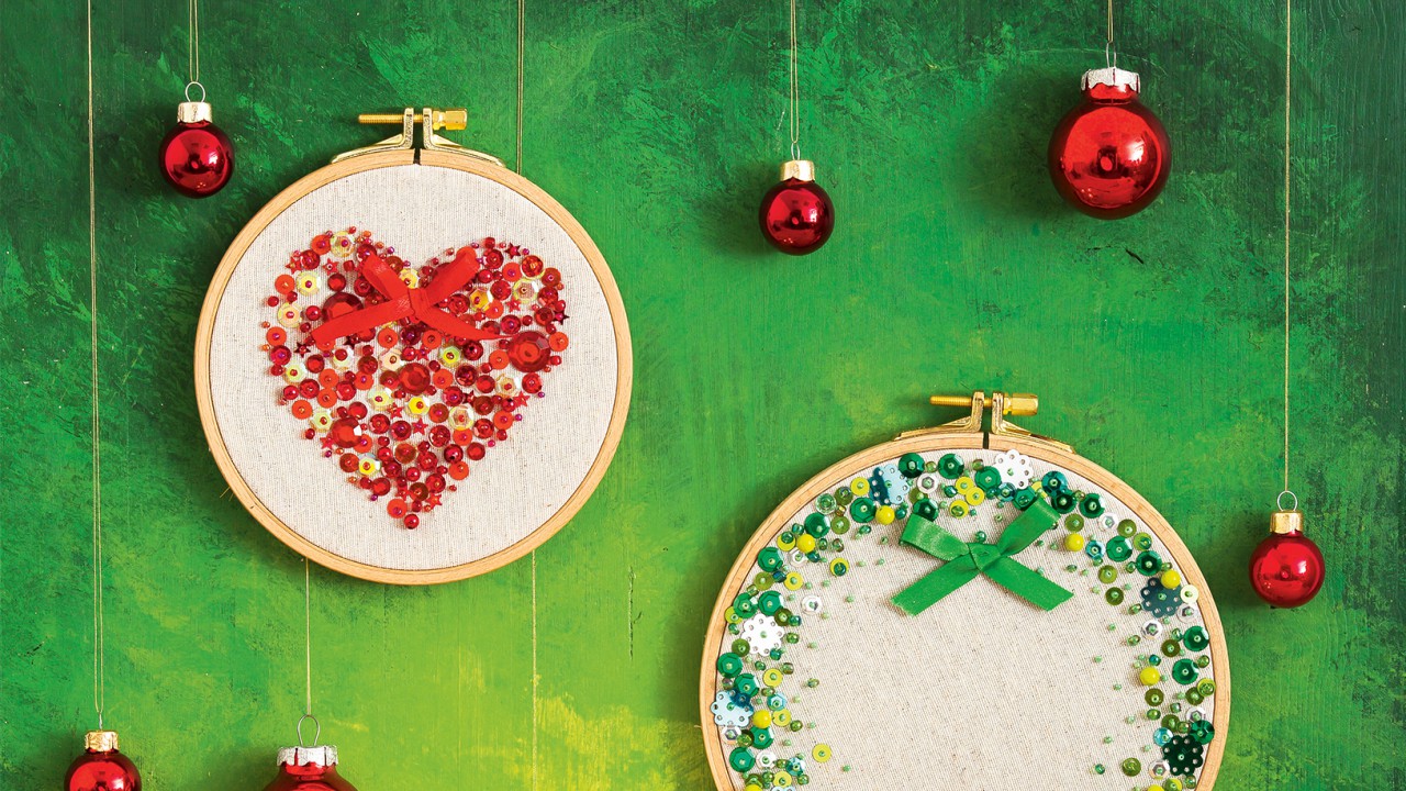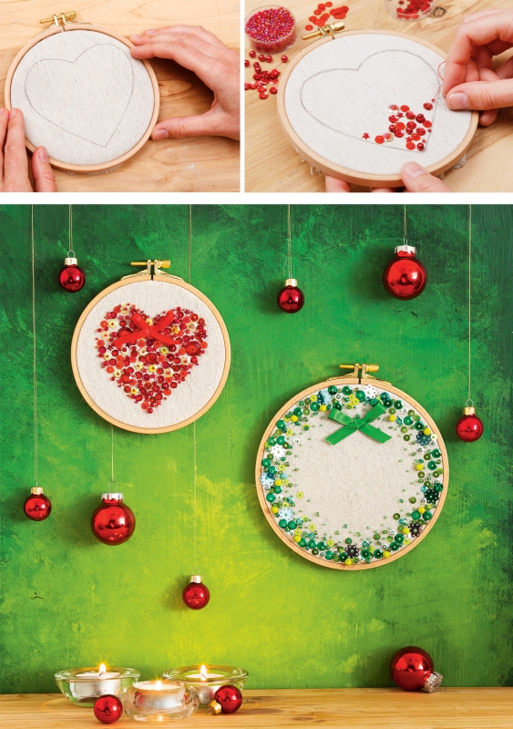 Egyszerű hímzőrámába kedves kis képet készíthetsz. Elég egy textilt a keretbe feszíteni, és az általad kedvelt egyszerű mintát kivarrni csillogó flitterekkel és gyöngyökkel. A piros és a zöld szín garantáltan elhozza a várva-várt karácsony hangulatát, de az ragyogó ezüst is nagyszerű választás. A végén még öltögess fel rá egy masnit is és a széleken kilogó textilvégeket vágd le a kerettől 1 cm-re.